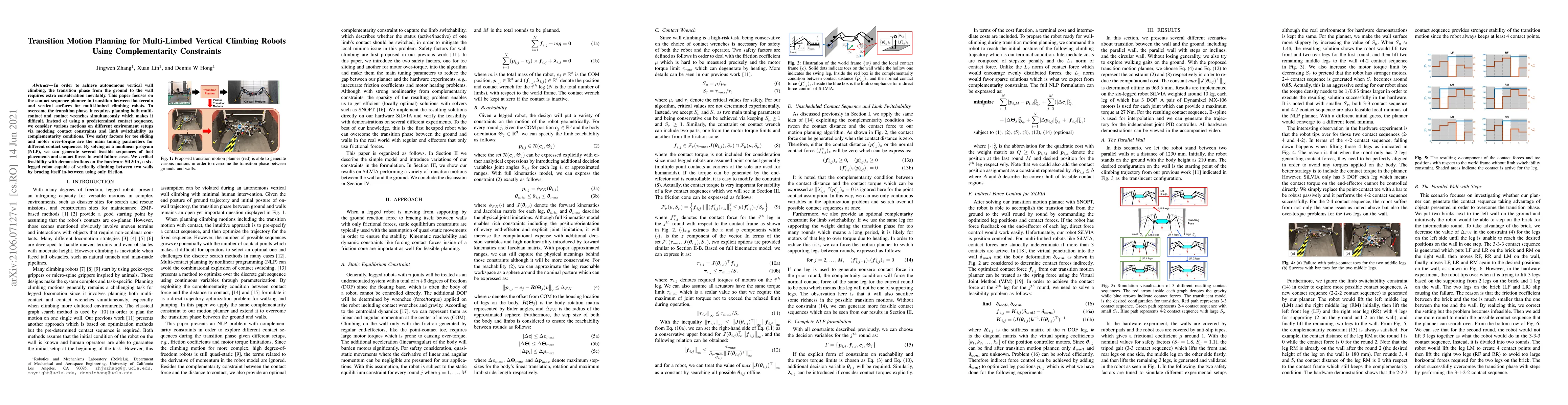 In order to achieve autonomous vertical wall climbing, the transition phase from the ground to the wall requires extra consideration inevitably. This paper focuses on the contact sequence planner to transition between flat terrain and vertical surfaces for multi-limbed climbing robots. To overcome the transition phase, it requires planning both multi-contact and contact wrenches simultaneously which makes it difficult. Instead of using a predetermined contact sequence, we consider various motions on different environment setups via modeling contact constraints and limb switchability as complementarity conditions. Two safety factors for toe sliding and motor over-torque are the main tuning parameters for different contact sequences. By solving as a nonlinear program (NLP), we can generate several feasible sequences of foot placements and contact forces to avoid failure cases. We verified feasibility with demonstrations on the hardware SiLVIA, a six-legged robot capable of vertically climbing between two walls by bracing itself in-between using only friction.