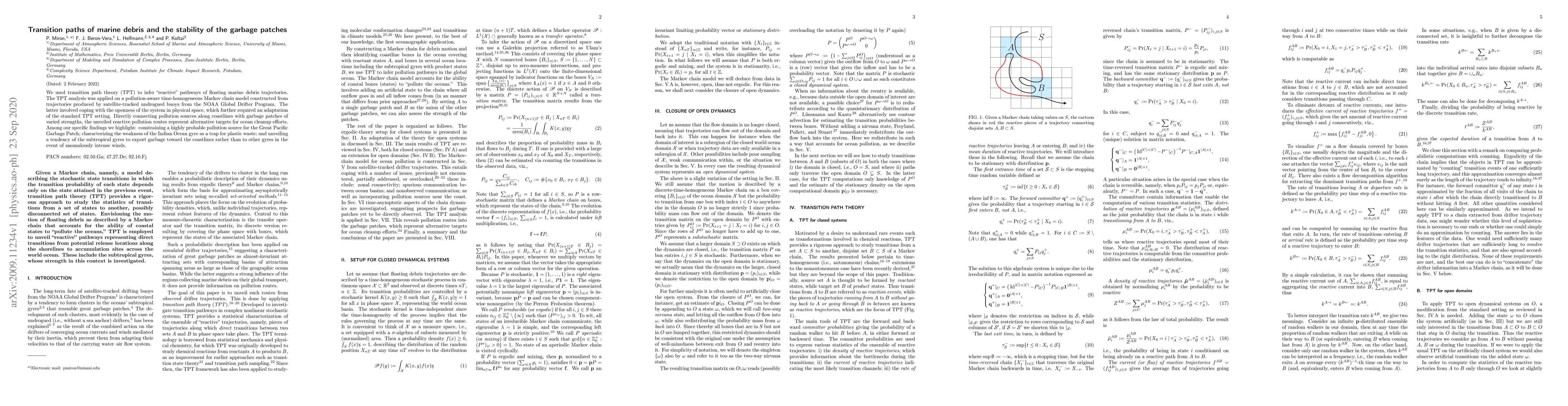 We used transition path theory (TPT) to infer "reactive" pathways of floating marine debris trajectories. The TPT analysis was applied on a pollution-aware time-homogeneous Markov chain model constructed from trajectories produced by satellite-tracked undrogued buoys from the NOAA Global Drifter Program. The latter involved coping with the openness of the system in physical space, which further required an adaptation of the standard TPT setting. Directly connecting pollution sources along coastlines with garbage patches of varied strengths, the unveiled reactive pollution routes represent alternative targets for ocean cleanup efforts. Among our specific findings we highlight: constraining a highly probable pollution source for the Great Pacific Garbage Patch; characterizing the weakness of the Indian Ocean gyre as a trap for plastic waste; and unveiling a tendency of the subtropical gyres to export garbage toward the coastlines rather than to other gyres in the event of anomalously intense winds.