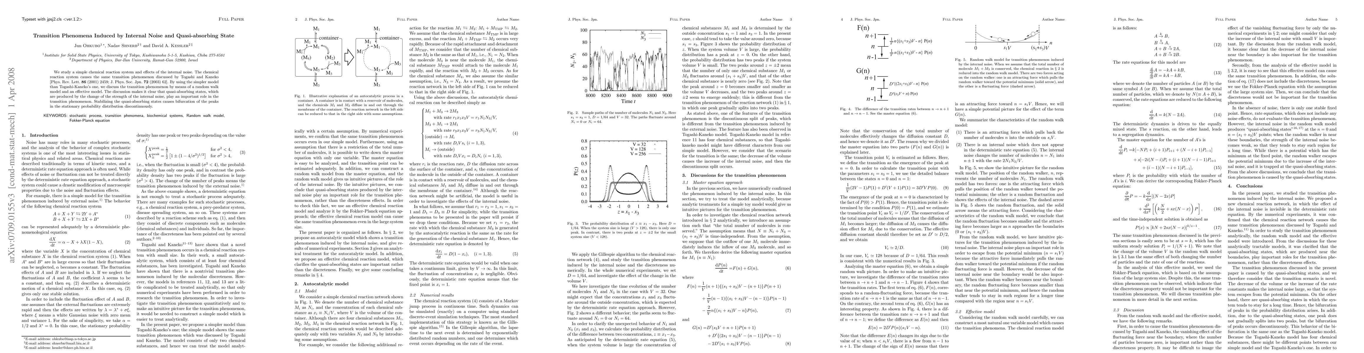 This paper investigates the transition phenomena in a simple chemical reaction system under internal noise, employing a random walk model and an effective model. It highlights the significant role of quasi-absorbing states in these transitions, revealing that their stabilization leads to a discontinuous bifurcation of peaks in the stationary probability distribution.