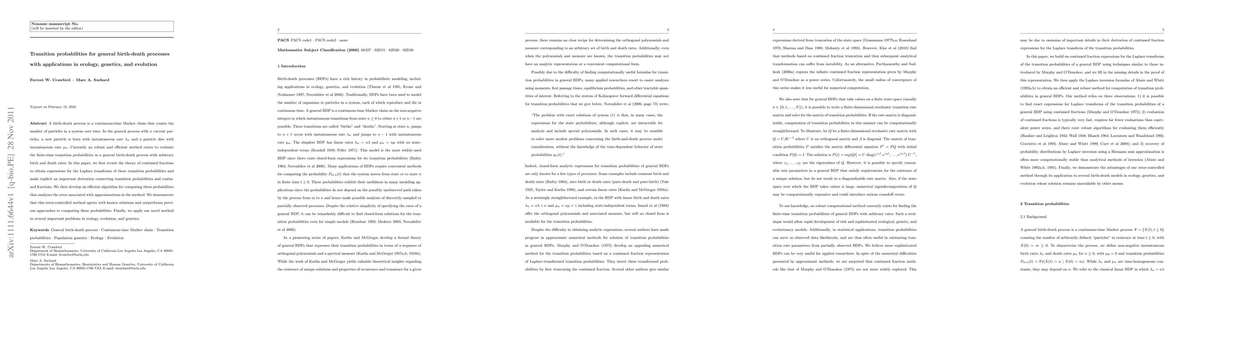 This paper develops a robust method for computing transition probabilities in general birth-death processes using continued fractions, presenting an efficient algorithm that outperforms previous approaches and applies this method to problems in ecology, genetics, and evolution.