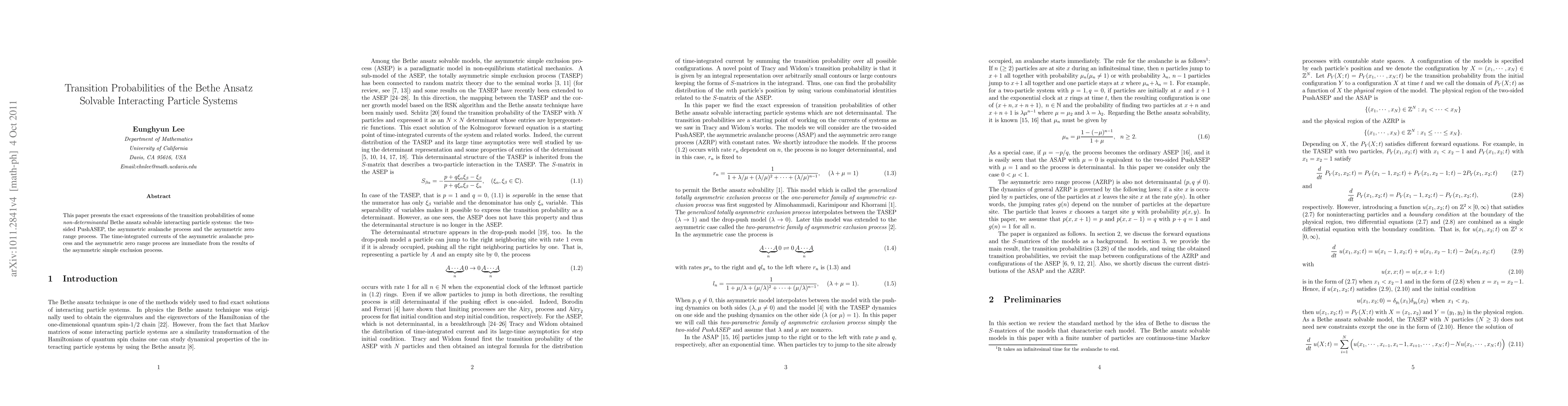 This paper derives exact expressions for transition probabilities in several Bethe ansatz solvable interacting particle systems, including the two-sided PushASEP, asymmetric avalanche process, and asymmetric zero range process. The results also provide insights into time integrated currents for the asymmetric avalanche and zero range processes.