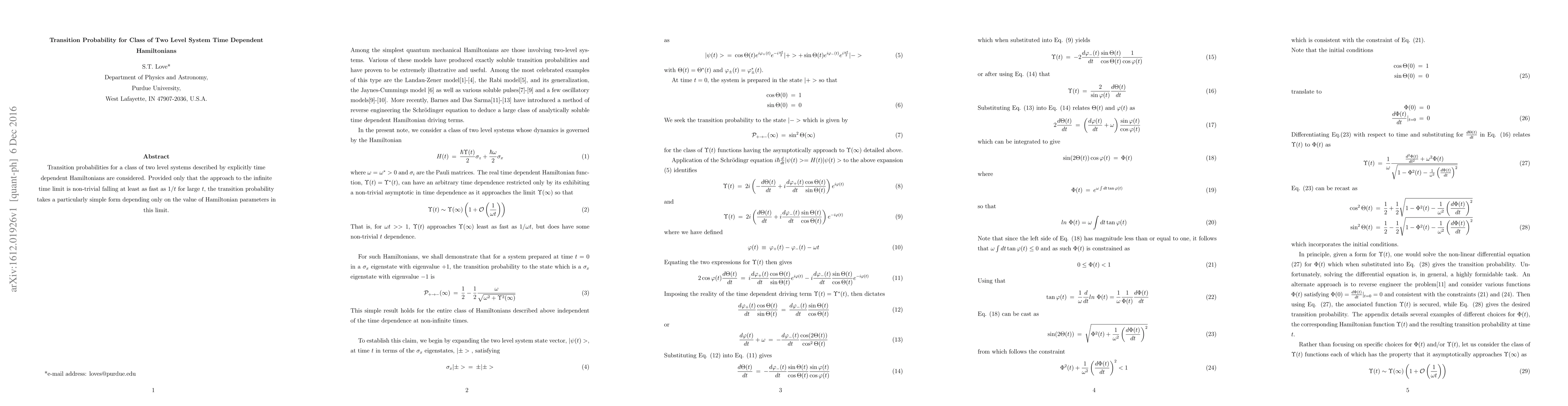 Summary: This paper examines transition probabilities in two-level systems with time-dependent Hamiltonians, showing that under certain asymptotic conditions, the transition probability simplifies and depends solely on the Hamiltonian parameters as time approaches infinity.