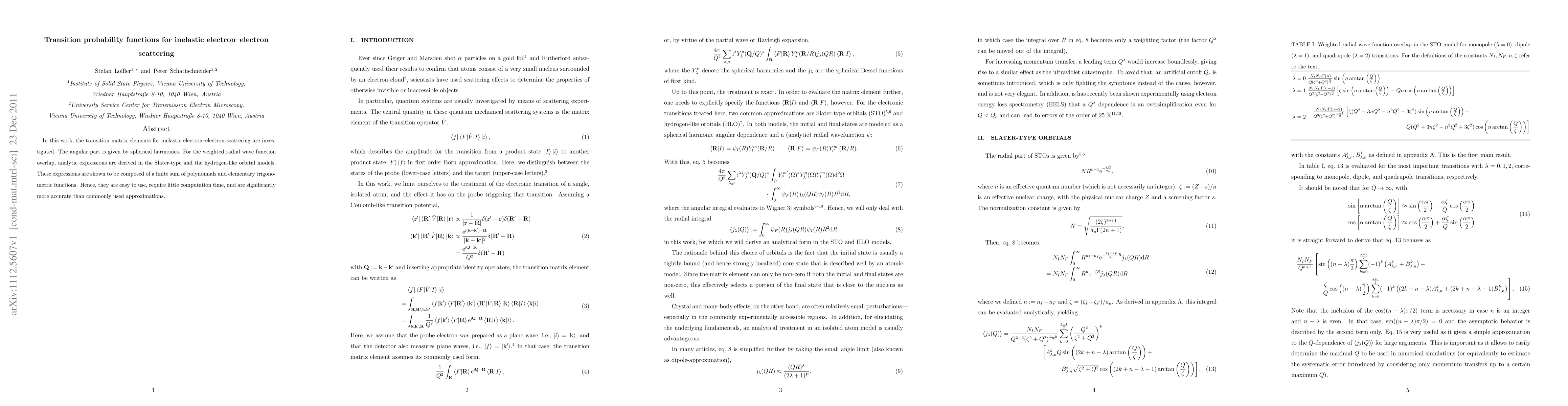 In this work, the transition matrix elements for inelastic electron--electron scattering are investigated. The angular part is given by spherical harmonics. For the weighted radial wave function overlap, analytic expressions are derived in the Slater-type and the hydrogen-like orbital models. These expressions are shown to be composed of a finite sum of polynomials and elementary trigonometric functions. Hence, they are easy to use, require little computation time, and are significantly more accurate than commonly used approximations.