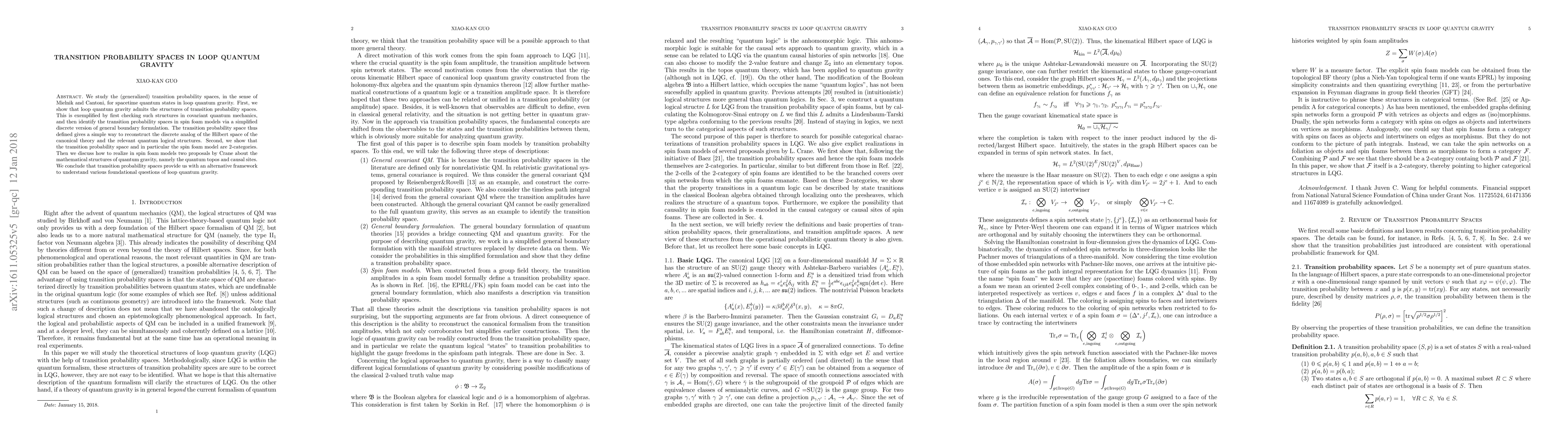 This paper explores the concept of transition probability spaces within loop quantum gravity, demonstrating their applicability through covariant quantum mechanics and spin foam models. It concludes that these spaces offer a new framework for addressing foundational issues in loop quantum gravity, including the realization of Crane's quantum topos and causal sites.