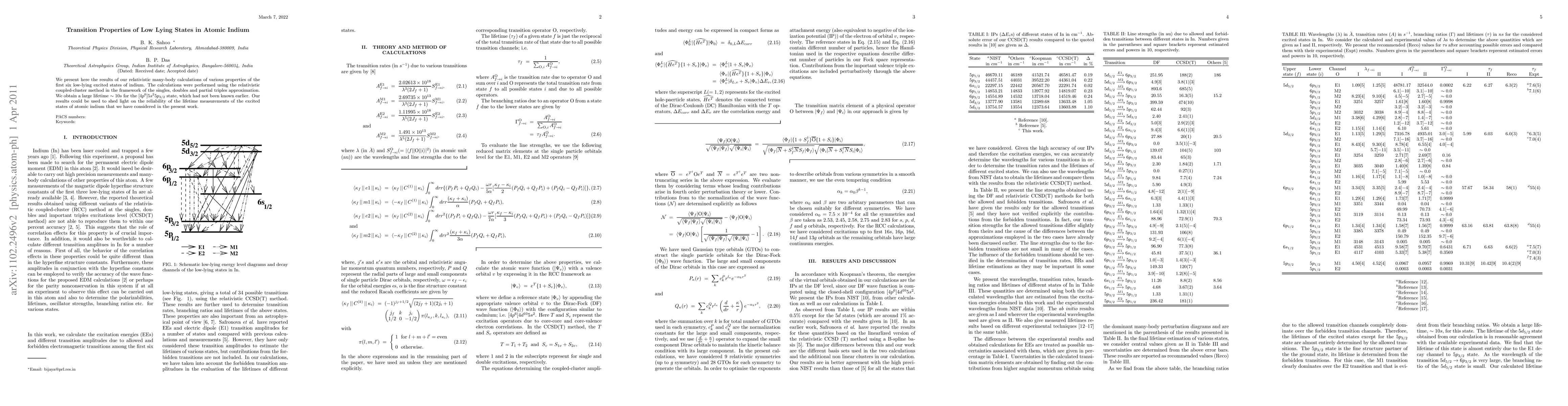 This study uses relativistic many-body calculations to analyze the first six low-lying excited states of indium, revealing a previously unknown large lifetime (~10s) for the [4p^6]5s^2 5p_{3/2} state, which can enhance the understanding of atomic indium's excited state measurements.