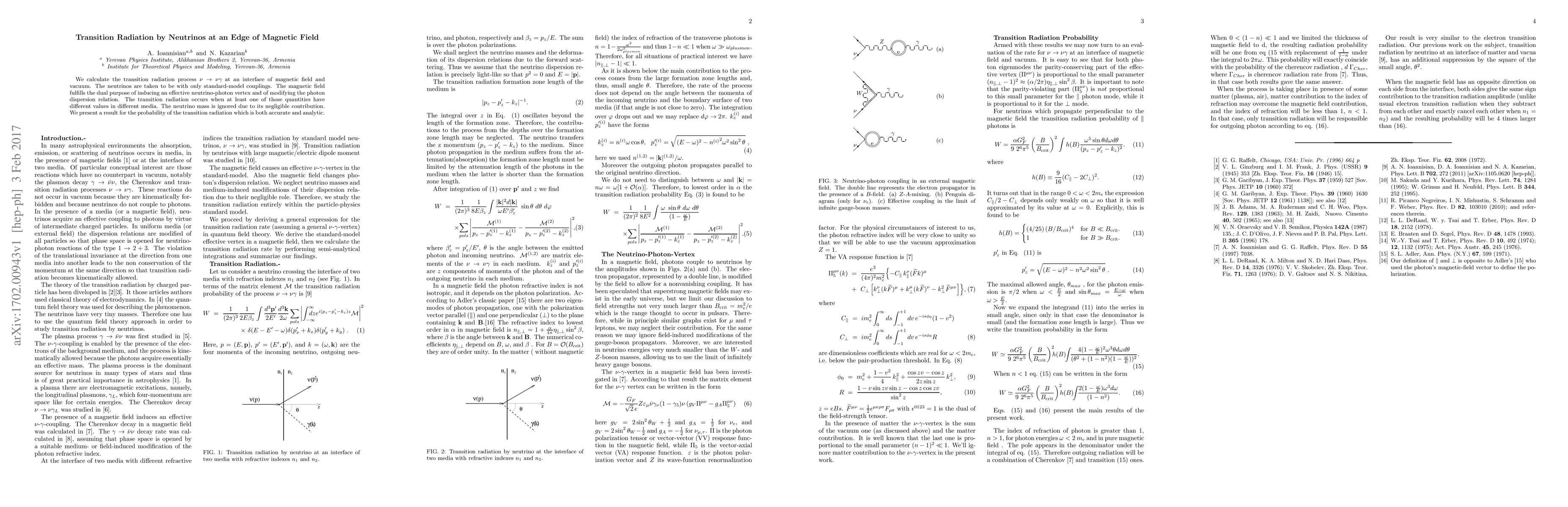 We calculate the transition radiation process $\nu \to \nu \gamma$ at an interface of magnetic field and vacuum. The neutrinos are taken to be with only standard-model couplings. The magnetic field fulfills the dual purpose of inducing an effective neutrino-photon vertex and of modifying the photon dispersion relation. The transition radiation occurs when at least one of those quantities have different values in different media. The neutrino mass is ignored due to its negligible contribution. We present a result for the probability of the transition radiation which is both accurate and analytic.