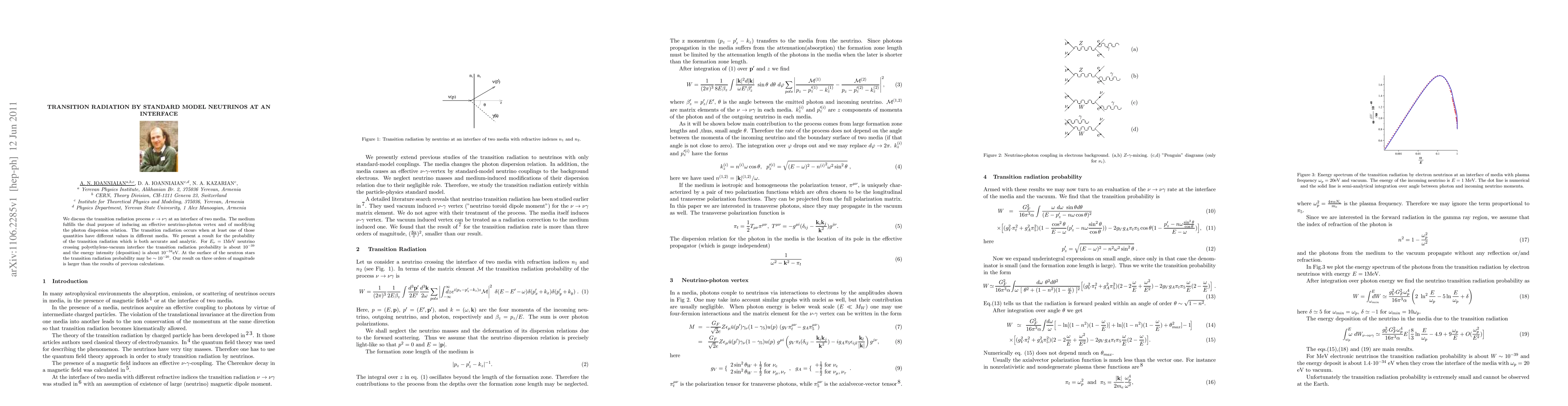 We discuss the transition radiation process $\nu \to \nu \gamma$ at an interface of two media. The medium fulfills the dual purpose of inducing an effective neutrino-photon vertex and of modifying the photon dispersion relation. The transition radiation occurs when at least one of those quantities have different values in different media. We present a result for the probability of the transition radiation which is both accurate and analytic. For $E_\nu =1$MeV neutrino crossing polyethylene-vacuum interface the transition radiation probability is about $10^{-39}$ and the energy intensity (deposition) is about $10^{-34}$eV. At the surface of the neutron stars the transition radiation probability may be $\sim 10^{-20}$. Our result on three orders of magnitude is larger than the results of previous calculations.}