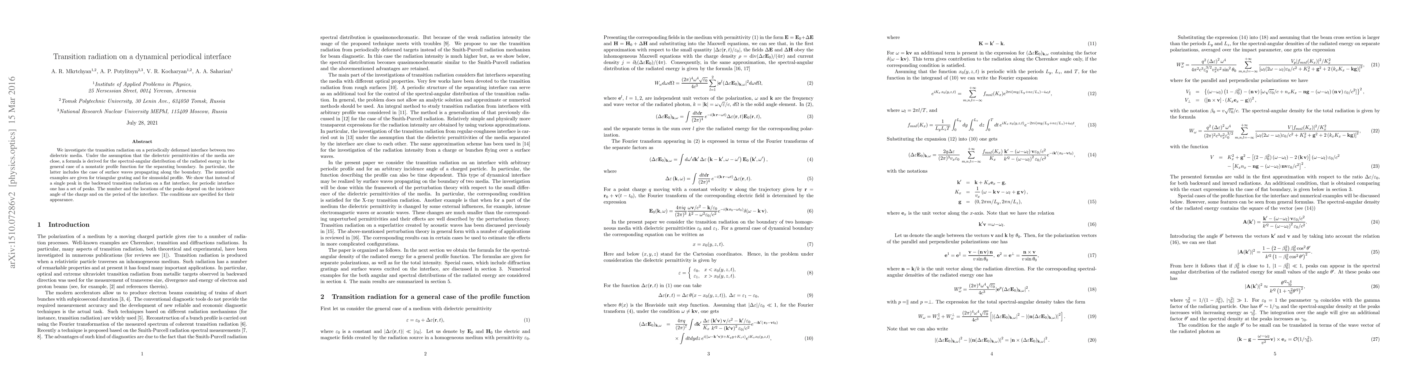 This research derives a formula for transition radiation on a periodically deformed interface between two similar dielectric media, revealing a set of peaks in the radiated energy spectrum instead of a single peak, with peak number and location dependent on the incidence angle and interface period.