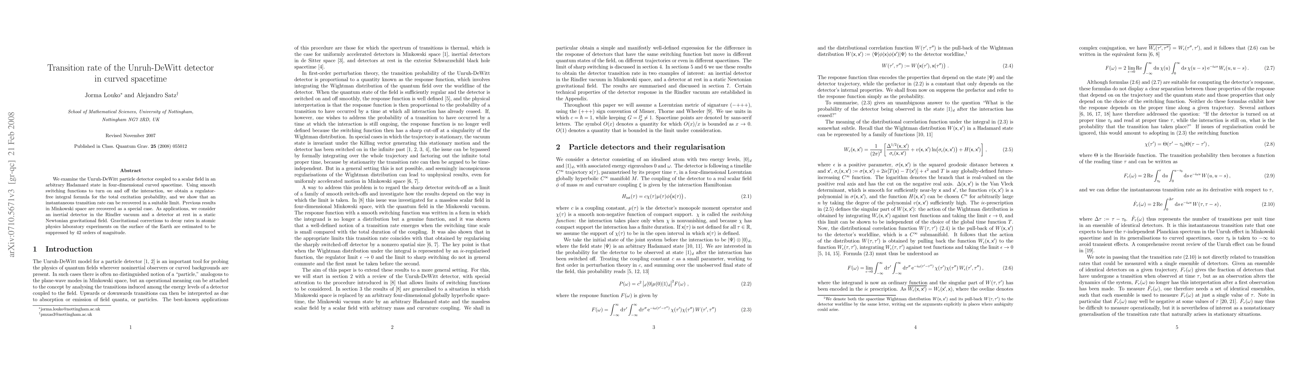 This paper investigates the transition rate of an Unruh-Dewitt detector in curved spacetime, deriving a regulator-free formula for the total excitation probability. It demonstrates that gravitational corrections to decay rates in terrestrial experiments are negligible, suppressed by 42 orders of magnitude.