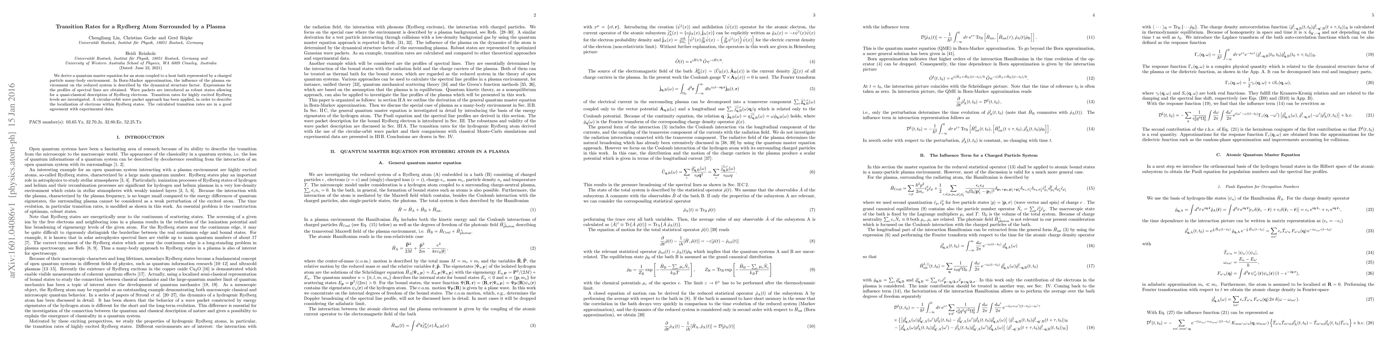 We derive a quantum master equation for an atom coupled to a heat bath represented by a charged particle many-body environment. In Born-Markov approximation, the influence of the plasma environment on the reduced system is described by the dynamical structure factor. Expressions for the profiles of spectral lines are obtained. Wave packets are introduced as robust states allowing for a quasi-classical description of Rydberg electrons. Transition rates for highly excited Rydberg levels are investigated. A circular-orbit wave packet approach has been applied, in order to describe the localization of electrons within Rydberg states. The calculated transition rates are in a good agreement with experimental data.