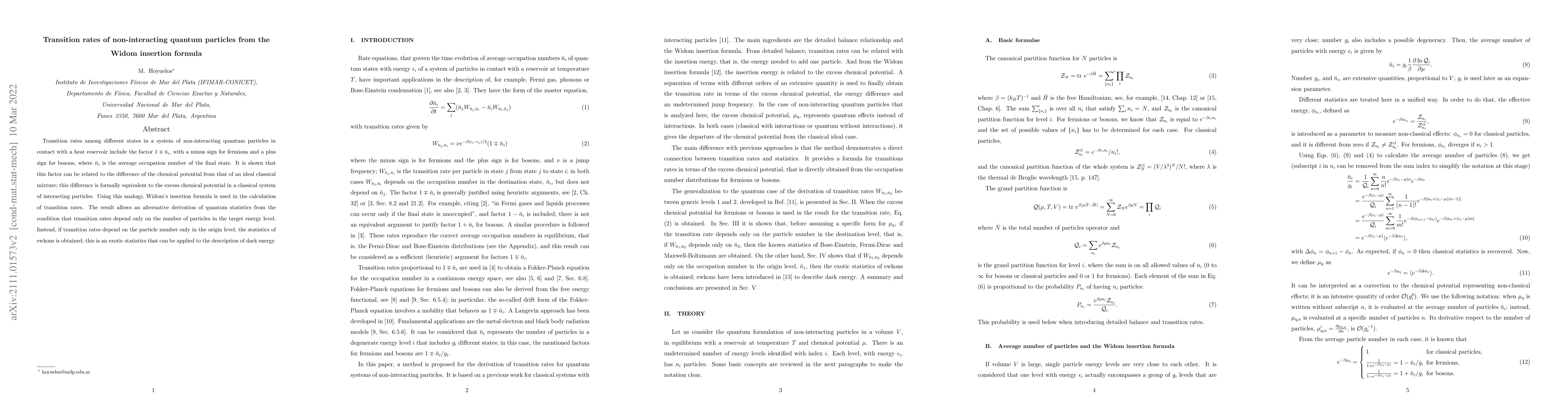 Transition rates among different states in a system of non-interacting quantum particles in contact with a heat reservoir include the factor $1\mp \bar{n}_i$, with a minus sign for fermions and a plus sign for bosons, where $\bar{n}_i$ is the average occupation number of the final state. It is shown that this factor can be related to the difference of the chemical potential from that of an ideal classical mixture; this difference is formally equivalent to the excess chemical potential in a classical system of interacting particles. Using this analogy, Widom's insertion formula is used in the calculation of transition rates. The result allows an alternative derivation of quantum statistics from the condition that transition rates depend only on the number of particles in the target energy level. Instead, if transition rates depend on the particle number only in the origin level, the statistics of ewkons is obtained; this is an exotic statistics that can be applied to the description of dark energy.