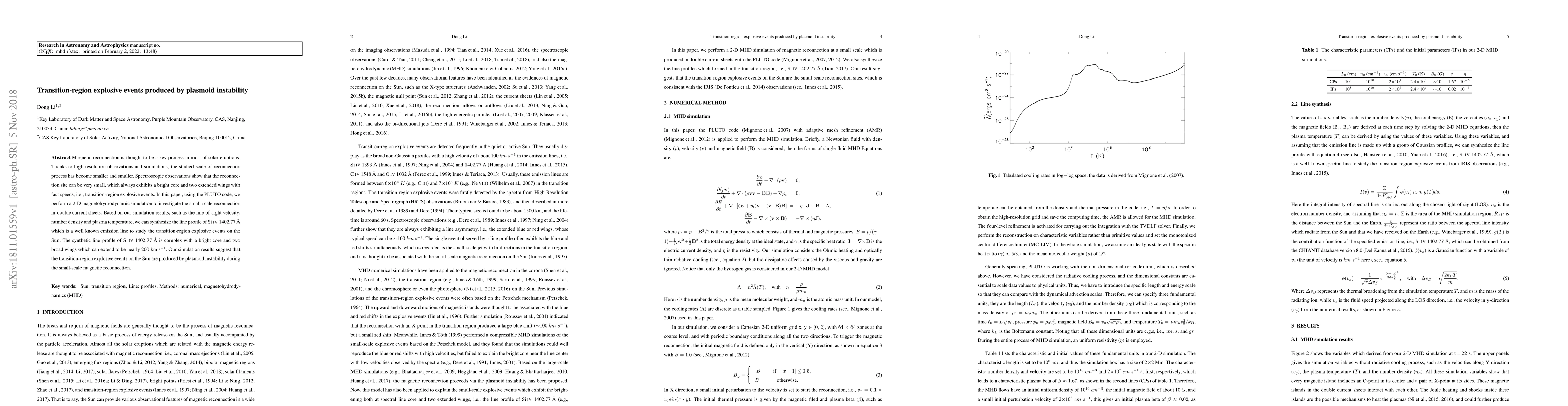 Magnetic reconnection is thought to be a key process in most of solar eruptions. Thanks to high-resolution observations and simulations, the studied scale of reconnection process has become smaller and smaller. Spectroscopic observations show that the reconnection site can be very small, which always exhibits a bright core and two extended wings with fast speeds, i.e., transition-region explosive events. In this paper, using the PLUTO code, we perform a 2-D magnetohydrodynamic simulation to investigate the small-scale reconnection in double current sheets. Based on our simulation results, such as the line-of-sight velocity, number density and plasma temperature, we can synthesize the line profile of Si IV 1402.77 A which is a well known emission line to study the transition-region explosive events on the Sun. The synthetic line profile of Si IV 1402.77 A is complex with a bright core and two broad wings which can extend to be nearly 200 km/s. Our simulation results suggest that the transition-region explosive events on the Sun are produced by plasmoid instability during the small-scale magnetic reconnection.