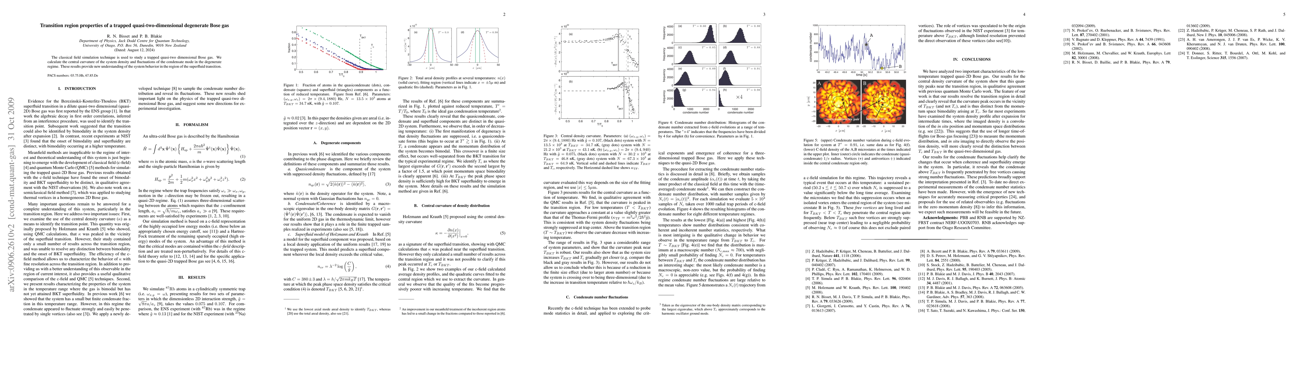 This paper uses c-field simulations to analyze a trapped quasi-two-dimensional degenerate Bose gas, focusing on the central curvature of the system density and condensate mode fluctuations. The findings offer insights into the superfluid transition behavior in this system.