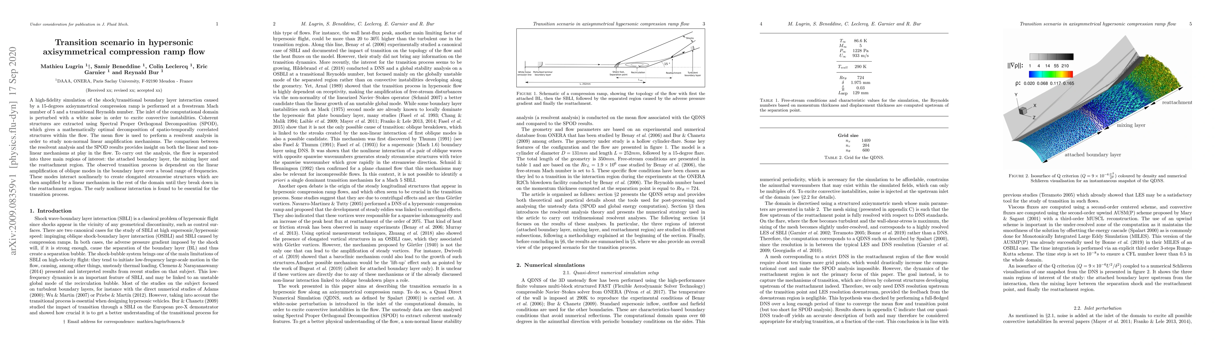This study investigates the shock/transitional boundary layer interaction in hypersonic axisymmetrical compression ramp flow using high-fidelity simulations and SPOD analysis. The transition process is driven by the linear amplification of oblique modes and their nonlinear interactions, leading to elongated streamwise structures that break down in the reattachment region.