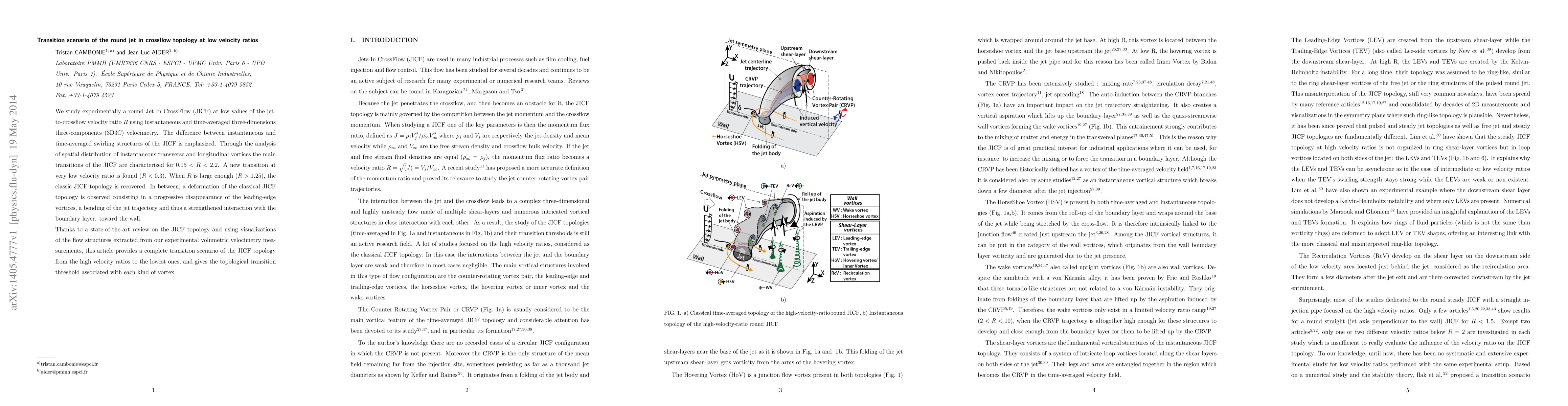 This paper experimentally investigates the transition scenarios of a round jet in crossflow (JICF) at low jet-to-crossflow velocity ratios, revealing a new transition at very low ratios (R < 0.3) and characterizing the deformation of the classical JICF topology between R = 1.25 and R = 0.3, including the disappearance of leading-edge vortices and enhanced interaction with the boundary layer.