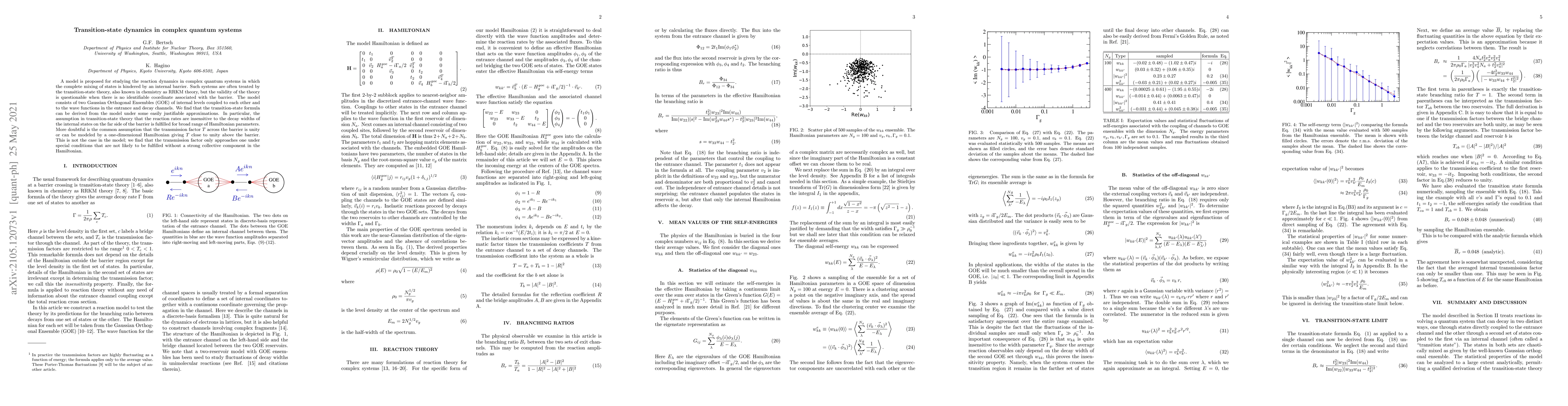 A model is proposed for studying the reaction dynamics in complex quantum systems in which the complete mixing of states is hindered by an internal barrier. Such systems are often treated by the transition-state theory, also known in chemistry as RRKM theory, but the validity of the theory is questionable when there is no identifiable coordinate associated with the barrier. The model consists of two Gaussian Orthogonal Ensembles (GOE) of internal levels coupled to each other and to the wave functions in the entrance and decay channels. We find that the transition-state formula can be derived from the model under some easily justifiable approximations. In particular, the assumption in transition-state theory that the reaction rates are insensitive to the decay widths of the internal states on the far side of the barrier is fulfilled for broad range of Hamiltonian parameters. More doubtful is the common assumption that the transmission factor $T$ across the barrier is unity or can be modeled by a one-dimensional Hamiltonian giving $T$ close to unity above the barrier. This is not the case in the model; we find that the transmission factor only approaches one under special conditions that are not likely to be fulfilled without a strong collective component in the Hamiltonian.