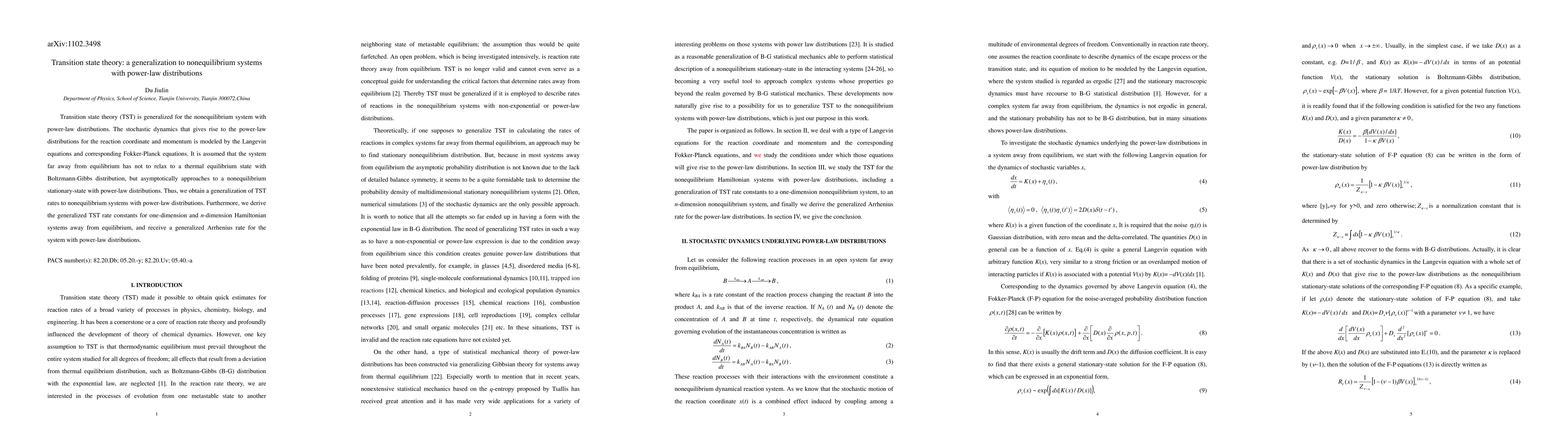 This paper generalizes transition state theory (TST) for nonequilibrium systems characterized by power-law distributions, modeling the stochastic dynamics with Langevin and Fokker-Planck equations. It derives generalized TST rates and Arrhenius rate constants for systems away from equilibrium, focusing on both one-dimensional and n-dimensional Hamiltonian systems.