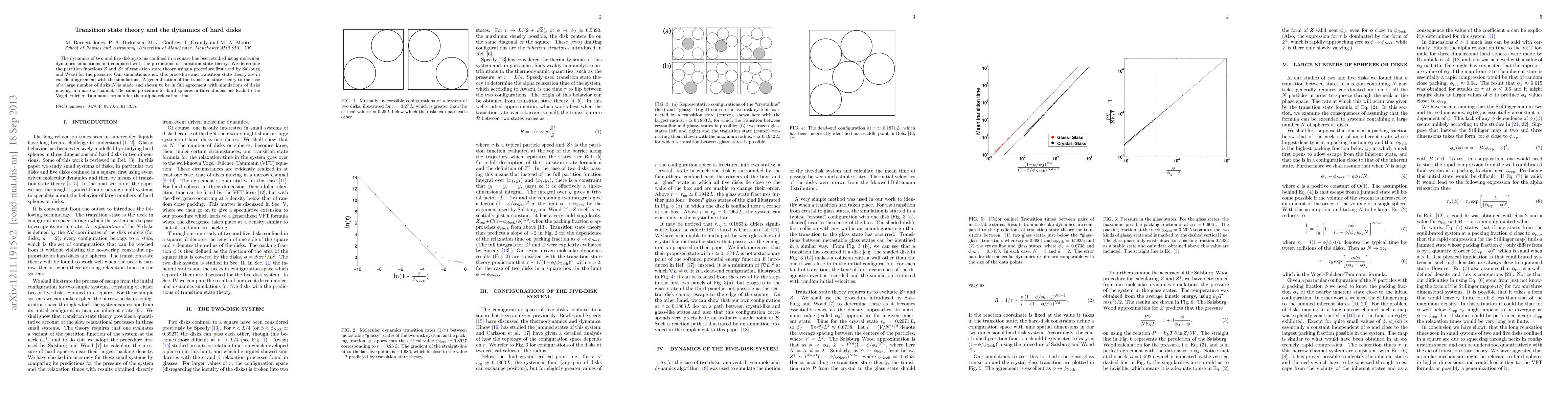 The dynamics of two and five disk systems confined in a square has been studied using molecular dynamics simulations and compared with the predictions of transition state theory. We determine the partition functions Z and Z^\ddagger of transition state theory using a procedure first used by Salsburg and Wood for the pressure. Our simulations show this procedure and transition state theory are in excellent agreement with the simulations. A generalization of the transition state theory to the case of a large number of disks N is made and shown to be in full agreement with simulations of disks moving in a narrow channel. The same procedure for hard spheres in three dimensions leads to the Vogel-Fulcher-Tammann formula for their alpha relaxation time.