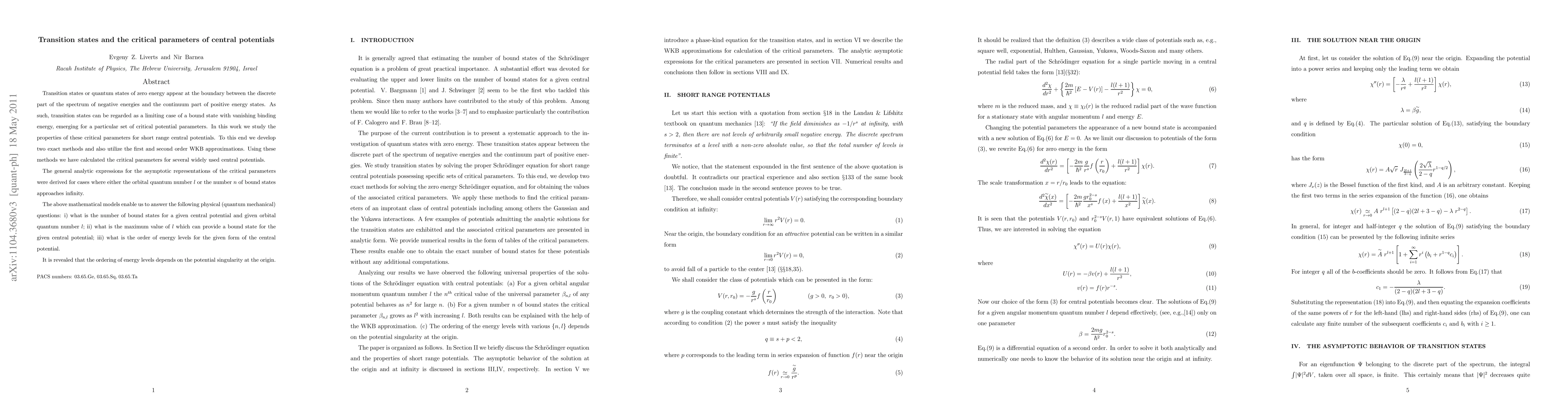 Transition states or quantum states of zero energy appear at the boundary between the discrete part of the spectrum of negative energies and the continuum part of positive energy states. As such, transition states can be regarded as a limiting case of a bound state with vanishing binding energy, emerging for a particular set of critical potential parameters. In this work we study the properties of these critical parameters for short range central potentials. To this end we develop two exact methods and also utilize the first and second order WKB approximations. Using these methods we have calculated the critical parameters for several widely used central potentials. The general analytic expressions for the asymptotic representations of the critical parameters were derived for cases where either the orbital quantum number $l$ or the number $n$ of bound states approaches infinity. The above mathematical models enable us to answer the following physical (quantum mechanical) questions: i) what is the number of bound states for a given central potential and given orbital quantum number $l$; ii) what is the maximum value of $l$ which can provide a bound state for the given central potential; iii) what is the order of energy levels for the given form of the central potential. It is revealed that the ordering of energy levels depends on the potential singularity at the origin.