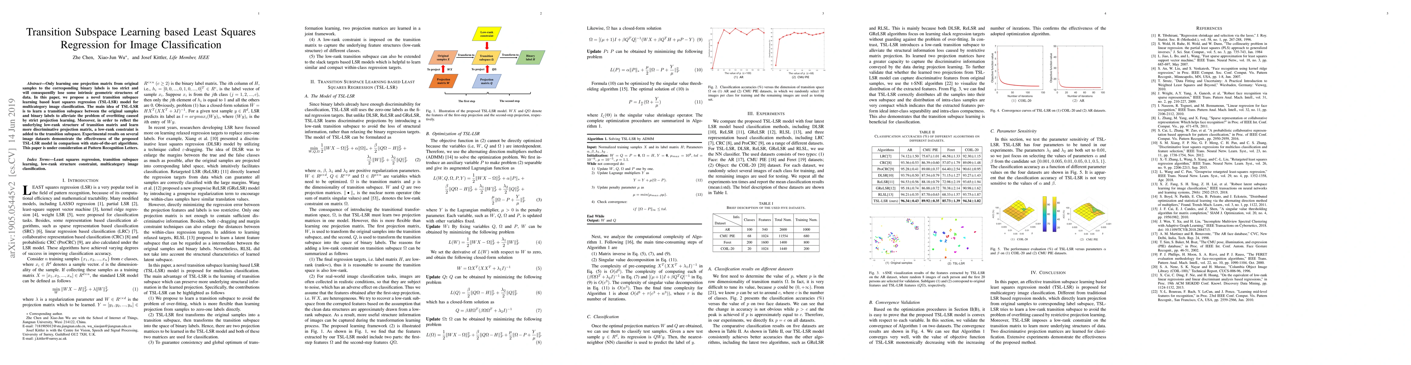 This paper proposes a transition subspace learning based least squares regression (TSL-LSR) model for multicategory image classification, aiming to alleviate overfitting by learning a transition subspace rather than a strict projection matrix. The model incorporates a low-rank constraint to enhance the discriminative power of the projection matrix, and experimental results show its effectiveness over state-of-the-art algorithms.