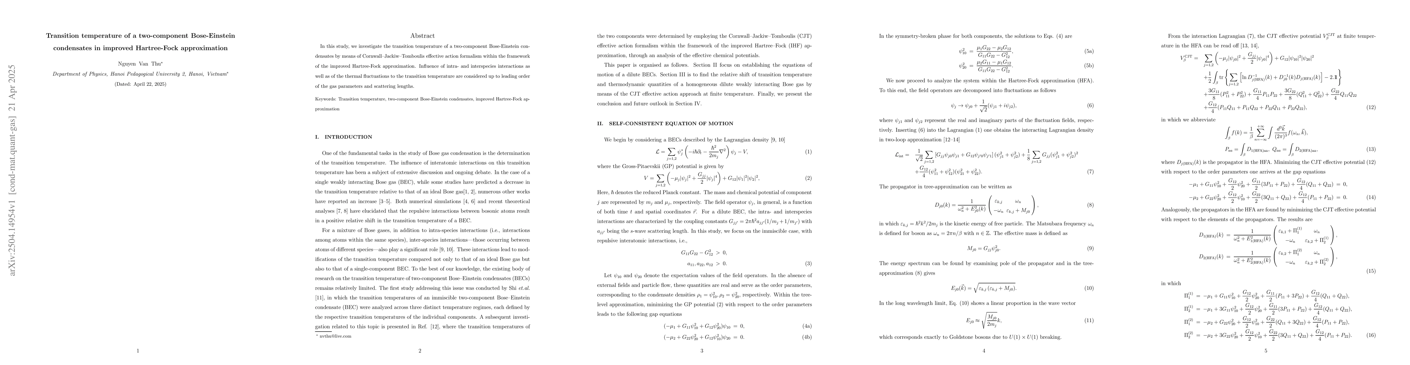 The study investigates the transition temperature of a two-component Bose-Einstein condensates using the Cornwall-Jackiw-Tomboulis effective action formalism within the improved Hartree-Fock approximation, considering intra- and interspecies interactions and thermal fluctuations up to leading order of gas parameters and scattering lengths.