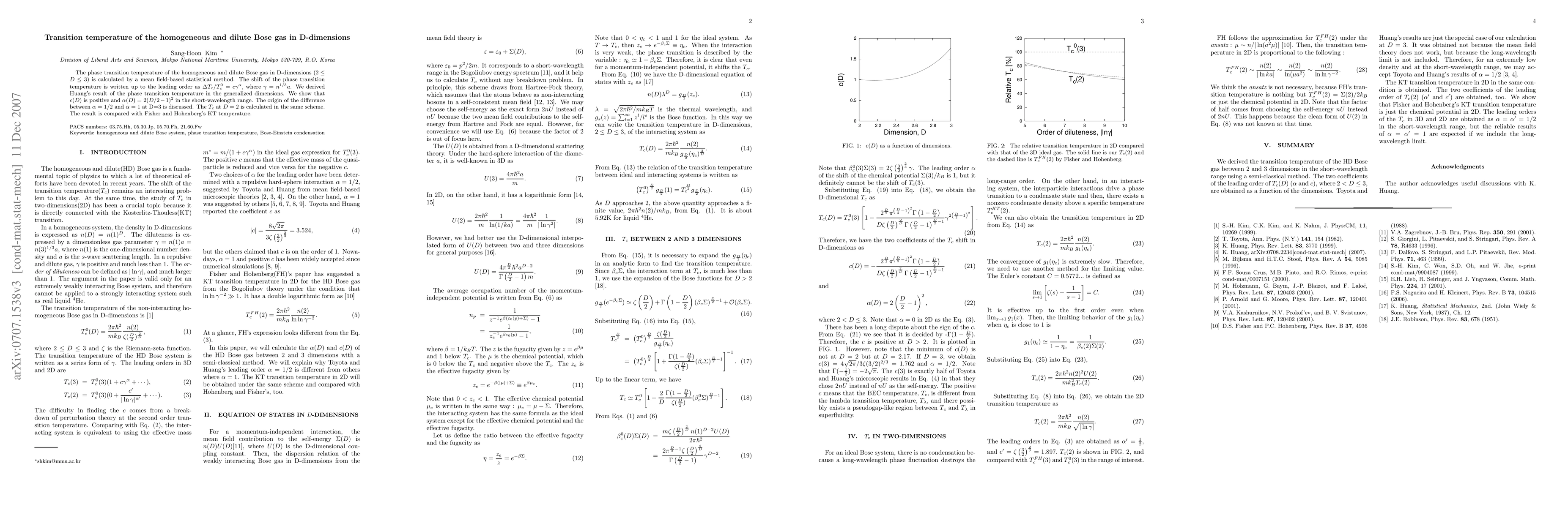 The phase transition temperature of the homogeneous and dilute Bose gas in D-dimensions ($2 \le D \le 3$) is calculated by a mean field-based statistical method. The shift of the phase transition temperature is written up to the leading order as $\Delta T_c/T_c^0 = c \gam^{\al}$, where $\gam=n^{1/3}a$. We derived Huang's result of the phase transition temperature in the generalized dimensions. We show that $ c(D)$ is positive and $\al(D)=2(D/2-1)^2$ in the short-wavelength range. The origin of the difference between $\al=1/2$ and $\al=1$ at D=3 is discussed. The $T_c$ at D=2 is calculated in the same scheme. The result is compared with Fisher and Hohenberg's KT temperature.
