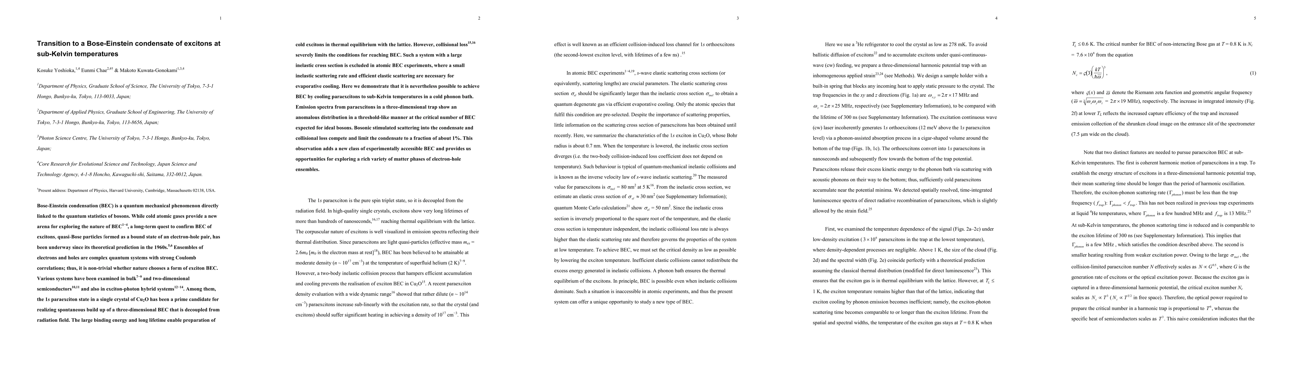 Bose-Einstein condensation (BEC) is a quantum mechanical phenomenon directly linked to the quantum statistics of bosons. While cold atomic gases provide a new arena for exploring the nature of BEC, a long-term quest to confirm BEC of excitons, quasi-Bose particles formed as a bound state of an electron-hole pair, has been underway since its theoretical prediction in the 1960s. Ensembles of electrons and holes are complex quantum systems with strong Coulomb correlations; thus, it is non-trivial whether nature chooses a form of exciton BEC. Various systems have been examined in bulk and two-dimensional semiconductors and also exciton-photon hybrid systems. Among them, the 1s paraexciton state in a single crystal of Cu2O has been a prime candidate for realizing three-dimensional BEC. The large binding energy and long lifetime enable preparation of cold excitons in thermal equilibrium with the lattice and decoupled from the radiation field. However, collisional loss severely limits the conditions for reaching BEC. Such a system with a large inelastic cross section is excluded in atomic BEC experiments, where a small inelastic scattering rate and efficient elastic scattering are necessary for evaporative cooling. Here we demonstrate that it is nevertheless possible to achieve BEC by cooling paraexcitons to sub-Kelvin temperatures in a cold phonon bath. Emission spectra from paraexcitons in a three-dimensional trap show an anomalous distribution in a threshold-like manner at the critical number of BEC expected for ideal bosons. Bosonic stimulated scattering into the condensate and collisional loss compete and limit the condensate to a fraction of about 1%. This observation adds a new class of experimentally accessible BEC for exploring a rich variety of matter phases of electron-hole ensembles.