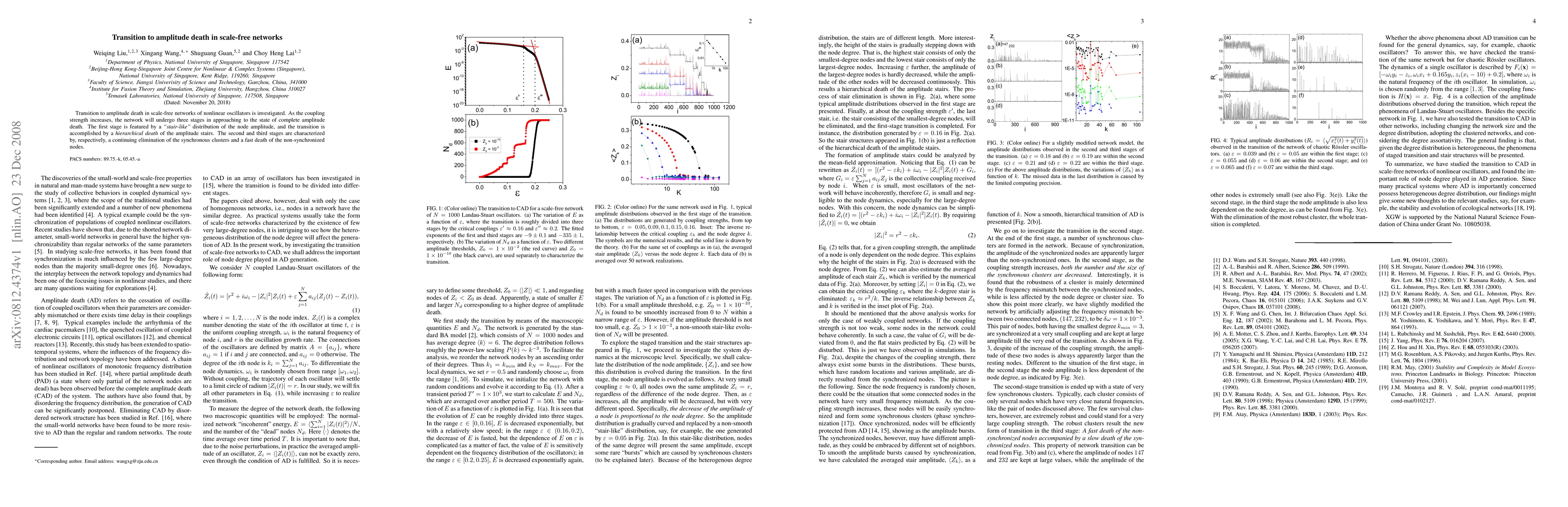 Transition to amplitude death in scale-free networks of nonlinear oscillators is investigated. As the coupling strength increases, the network will undergo three stages in approaching to the state of complete amplitude death. The first stage is featured by a \emph{"stair-like"} distribution of the node amplitude, and the transition is accomplished by a \emph{hierarchical death} of the amplitude stairs. The second and third stages are characterized by, respectively, a continuing elimination of the synchronous clusters and a fast death of the non-synchronized nodes.