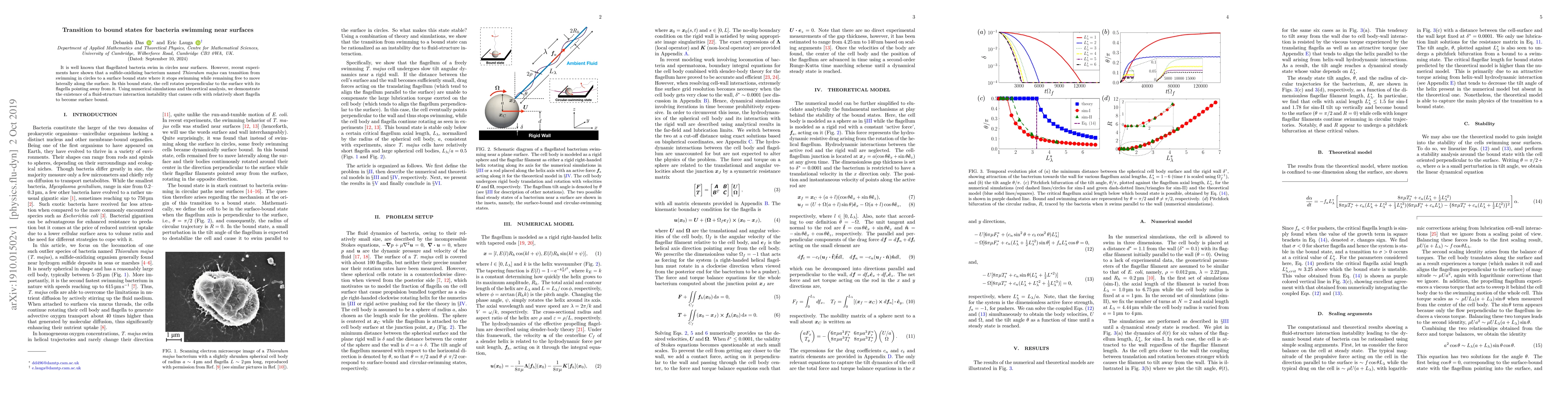 This paper investigates the transition of Thiovulum majus bacteria from circular swimming near surfaces to a bound state where they rotate perpendicularly along the surface. Numerical simulations and theoretical analysis reveal a fluid-structure interaction instability leading to this behavior in cells with shorter flagella.