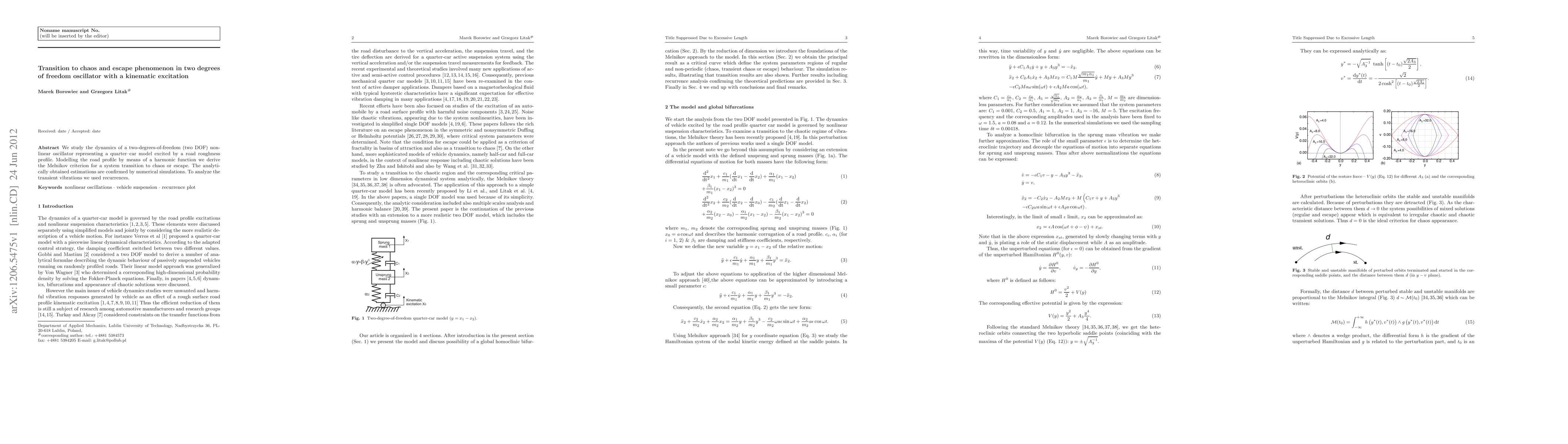 We study the dynamics of a two-degrees-of-freedom (two DOF) nonlinear oscillator representing a quartercar model excited by a road roughness profile. Modelling the road profile by means of a harmonic function we derive the Melnikov criterion for a system transition to chaos or escape. The analytically obtained estimations are confirmed by numerical simulations. To analyze the transient vibrations we used recurrences.