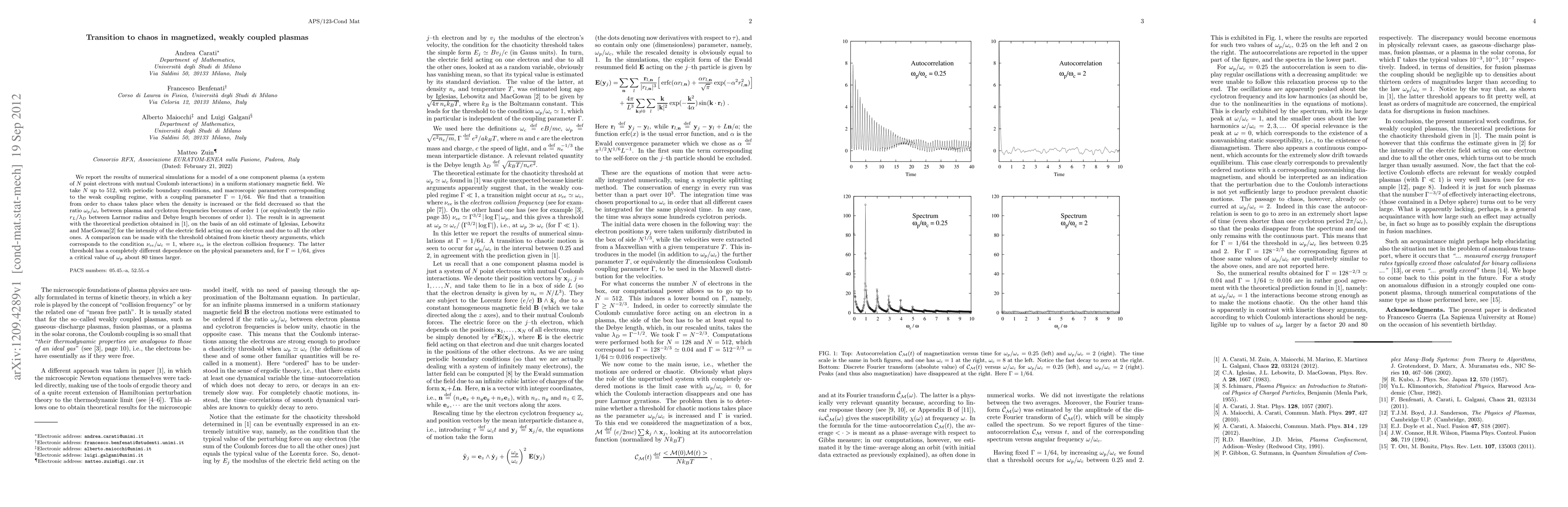 We report the results of numerical simulations for a model of a one component plasma (a system of N point electrons with mutual Coulomb interactions) in a uniform stationary magnetic field. We take N up to 512, with periodic boundary conditions, and macroscopic parameters corresponding to the weak coupling regime, with a coupling parameter \Gamma=1/64. We find that a transition from order to chaos takes place when the density is increased or the field decreased so that the ratio \omega_p/\omega_c between plasma and cyclotron frequencies becomes of order 1 (or equivalently the ratio r_L/\lambda_D between Larmor radius and Debye length becomes of order 1). The result is in agreement with the theoretical prediction obtained in [1], on the basis of an old estimate of Iglesias, Lebowitz and MacGowan [2] for the intensity of the electric field acting on one electron and due to all the other ones. A comparison can be made with the threshold obtained from kinetic theory arguments, which corresponds to the condition \nu_{ee}/\omega_c=1, where \nu_{ee} is the electron collision frequency. The latter threshold has a completely different dependence on the physical parameters and, for \Gamma=1/64, gives a critical value of \omega_p about 80 times larger.