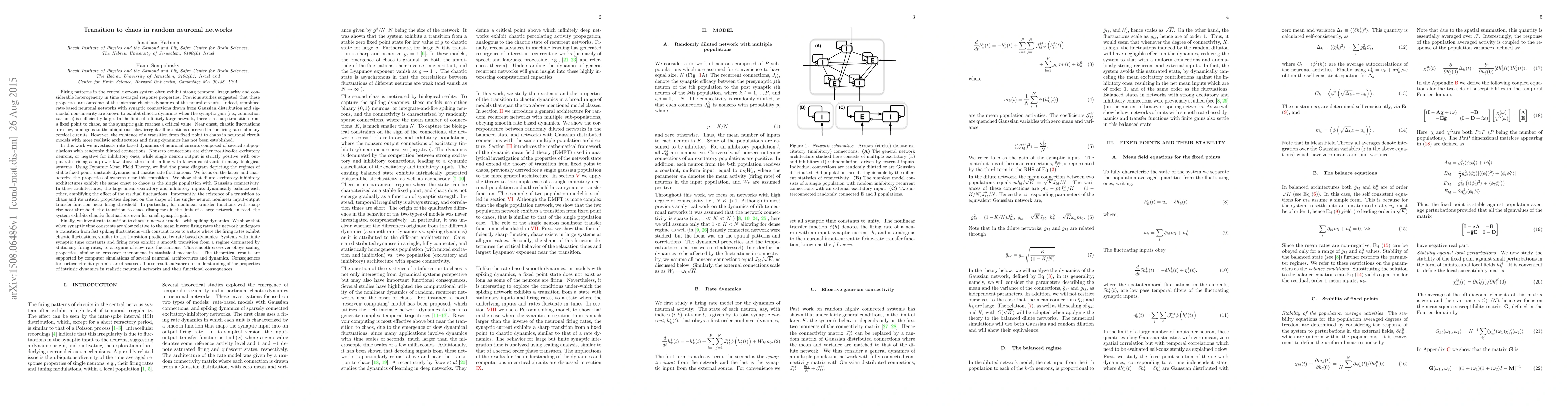 Firing patterns in the central nervous system often exhibit strong temporal irregularity and heterogeneity in their time averaged response properties. Previous studies suggested that these properties are outcome of an intrinsic chaotic dynamics. Indeed, simplified rate-based large neuronal networks with random synaptic connections are known to exhibit sharp transition from fixed point to chaotic dynamics when the synaptic gain is increased. However, the existence of a similar transition in neuronal circuit models with more realistic architectures and firing dynamics has not been established. In this work we investigate rate based dynamics of neuronal circuits composed of several subpopulations and random connectivity. Nonzero connections are either positive-for excitatory neurons, or negative for inhibitory ones, while single neuron output is strictly positive; in line with known constraints in many biological systems. Using Dynamic Mean Field Theory, we find the phase diagram depicting the regimes of stable fixed point, unstable dynamic and chaotic rate fluctuations. We characterize the properties of systems near the chaotic transition and show that dilute excitatory-inhibitory architectures exhibit the same onset to chaos as a network with Gaussian connectivity. Interestingly, the critical properties near transition depend on the shape of the single- neuron input-output transfer function near firing threshold. Finally, we investigate network models with spiking dynamics. When synaptic time constants are slow relative to the mean inverse firing rates, the network undergoes a sharp transition from fast spiking fluctuations and static firing rates to a state with slow chaotic rate fluctuations. When the synaptic time constants are finite, the transition becomes smooth and obeys scaling properties, similar to crossover phenomena in statistical mechanics