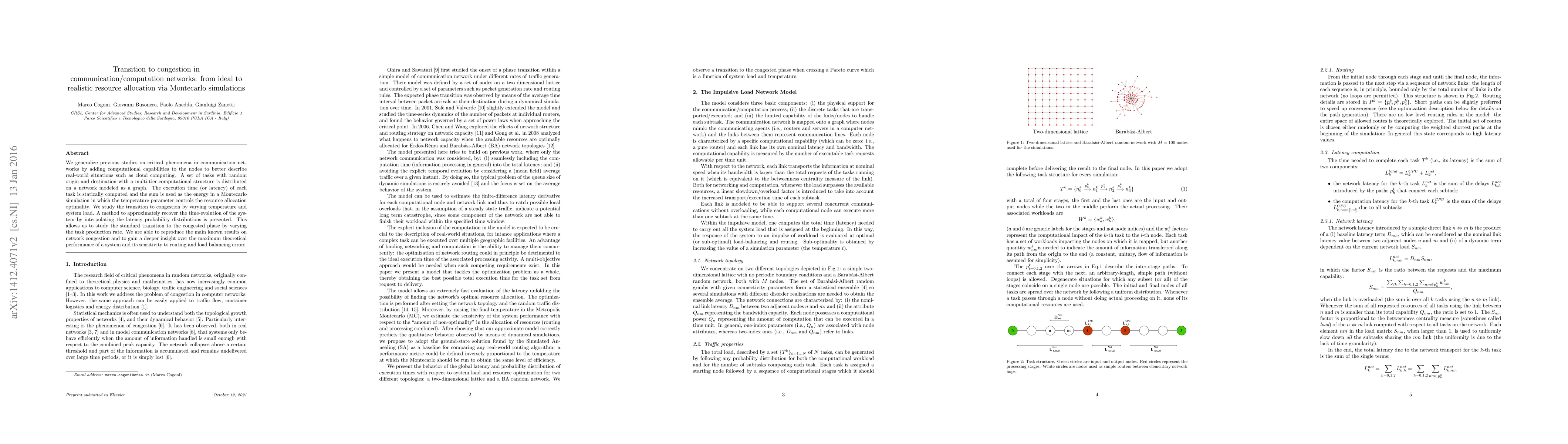 We generalize previous studies on critical phenomena in communication networks by adding computational capabilities to the nodes to better describe real-world situations such as cloud computing. A set of tasks with random origin and destination with a multi-tier computational structure is distributed on a network modeled as a graph. The execution time (or latency) of each task is statically computed and the sum is used as the energy in a Montecarlo simulation in which the temperature parameter controls the resource allocation optimality. We study the transition to congestion by varying temperature and system load. A method to approximately recover the time-evolution of the system by interpolating the latency probability distributions is presented. This allows us to study the standard transition to the congested phase by varying the task production rate. We are able to reproduce the main known results on network congestion and to gain a deeper insight over the maximum theoretical performance of a system and its sensitivity to routing and load balancing errors.