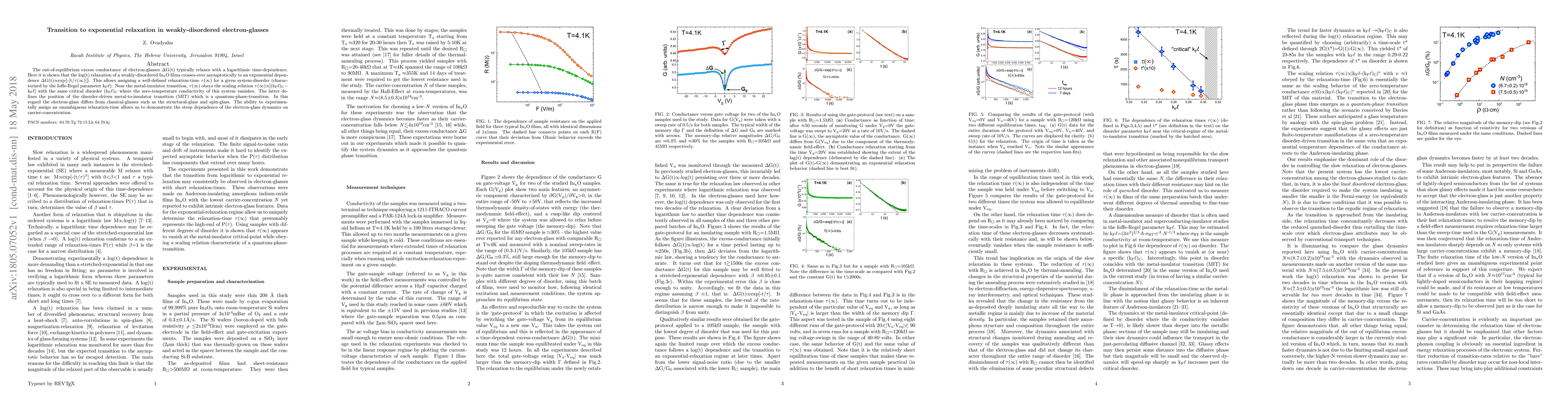 This paper investigates the relaxation behavior in weakly-disordered electron-glasses, finding that their excess conductance transitions from logarithmic to exponential relaxation. The study also reveals a defined relaxation time related to system disorder and the metal-insulator transition, highlighting differences from classical structural and spin glasses.