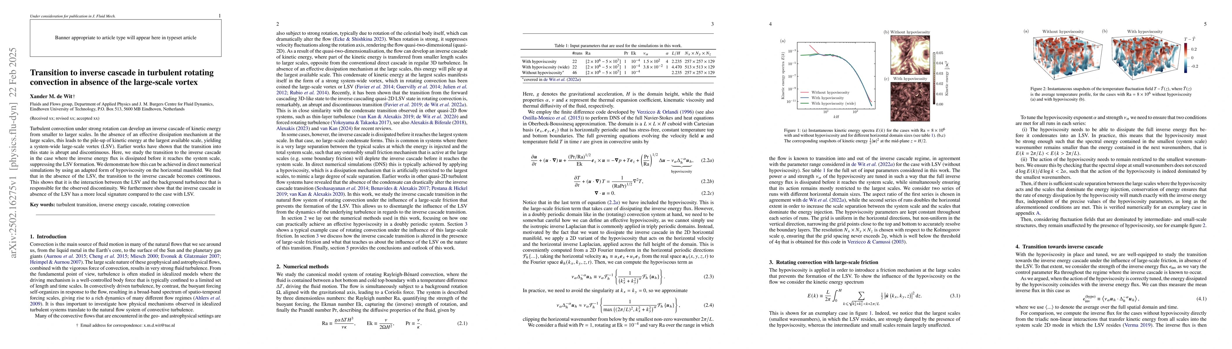 The paper introduces a method to suppress LSV formation using hypoviscosity, allowing for the observation of a continuous transition to the inverse cascade in rotating turbulent convection.