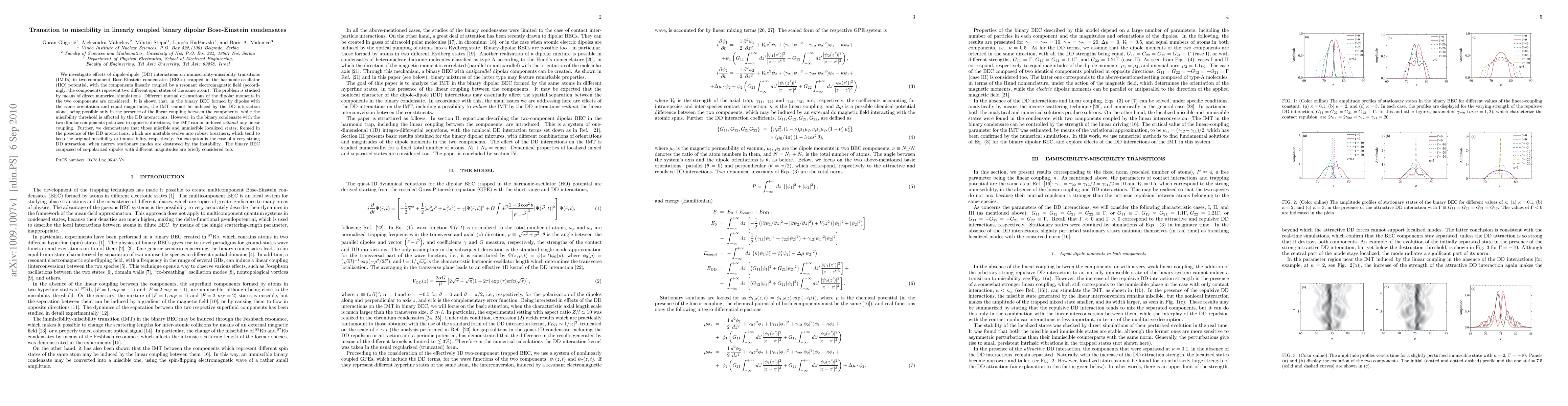 We investigate effects of dipole-dipole (DD) interactions on immiscibility-miscibility transitions (IMTs) in two-component Bose-Einstein condensates (BECs) trapped in the harmonic-oscillator (HO) potential, with the components linearly coupled by a resonant electromagnetic field (accordingly, the components represent two different spin states of the same atom). The problem is studied by means of direct numerical simulations. Different mutual orientations of the dipolar moments in the two components are considered. It is shown that, in the binary BEC formed by dipoles with the same orientation and equal magnitudes, the IMT cannot be induced by the DD interaction alone, being possible only in the presence of the linear coupling between the components, while the miscibility threshold is affected by the DD interactions. However, in the binary condensate with the two dipolar components polarized in opposite directions, the IMT can be induced \emph{without} any linear coupling. Further, we demonstrate that those miscible and immiscible localized states, formed in the presence of the DD interactions, which are unstable evolve into robust breathers, which tend to keep the original miscibility or immiscibility, respectively. An exception is the case of a very strong DD attraction, when narrow stationary modes are destroyed by the instability. The binary BEC composed of co-polarized dipoles with different magnitudes are briefly considered too.
