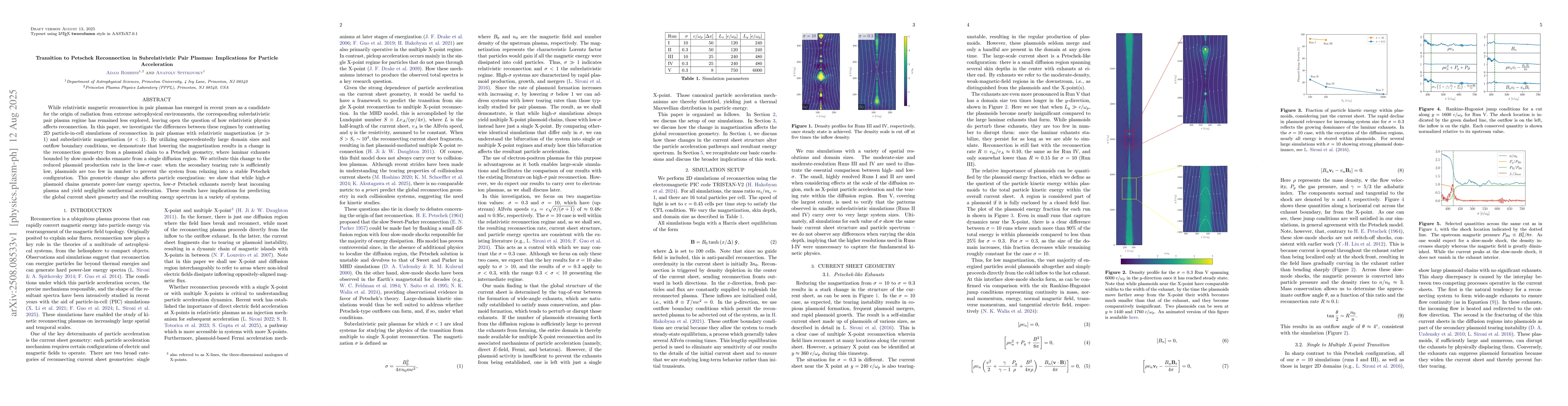 While relativistic magnetic reconnection in pair plasmas has emerged in recent years as a candidate for the origin of radiation from extreme astrophysical environments, the corresponding subrelativistic pair plasma regime has remained less explored, leaving open the question of how relativistic physics affects reconnection. In this paper, we investigate the differences between these regimes by contrasting 2D particle-in-cell simulations of reconnection in pair plasmas with relativistic magnetization ($\sigma \gg 1$) and subrelativistic magnetization ($\sigma < 1$). By utilizing unprecedentedly large domain sizes and outflow boundary conditions, we demonstrate that lowering the magnetization results in a change in the reconnection geometry from a plasmoid chain to a Petschek geometry, where laminar exhausts bounded by slow-mode shocks emanate from a single diffusion region. We attribute this change to the reduced plasmoid production rate in the low-$\sigma$ case: when the secondary tearing rate is sufficiently low, plasmoids are too few in number to prevent the system from relaxing into a stable Petschek configuration. This geometric change also affects particle energization: we show that while high-$\sigma$ plasmoid chains generate power-law energy spectra, low-$\sigma$ Petschek exhausts merely heat incoming plasma and yield negligible nonthermal acceleration. These results have implications for predicting the global current sheet geometry and the resulting energy spectrum in a variety of systems.