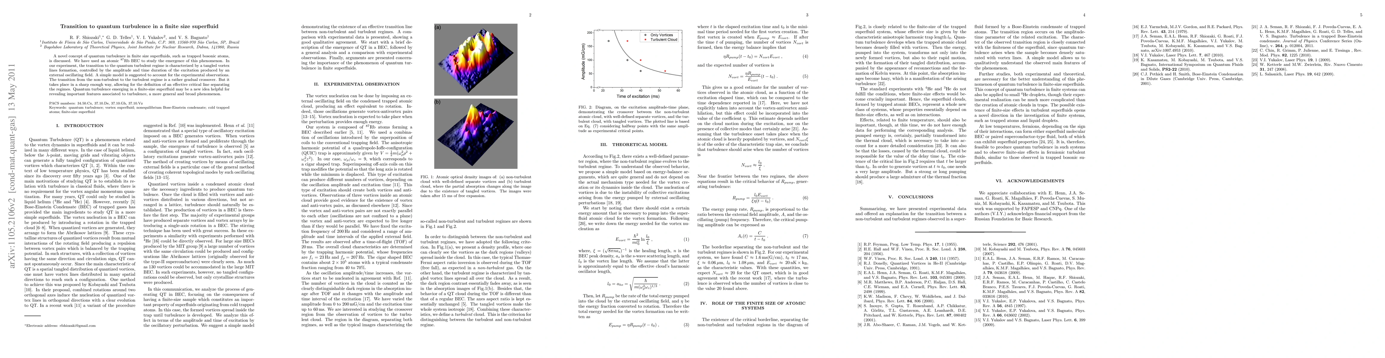 A novel concept of quantum turbulence in finite size superfluids, such as trapped bosonic atoms, is discussed. We have used an atomic $^{87}\mathrm{Rb}$ BEC to study the emergence of this phenomenon. In our experiment, the transition to the quantum turbulent regime is characterized by a tangled vortex lines formation, controlled by the amplitude and time duration of the excitation produced by an external oscillating field. A simple model is suggested to account for the experimental observations. The transition from the non-turbulent to the turbulent regime is a rather gradual crossover. But it takes place in a sharp enough way, allowing for the definition of an effective critical line separating the regimes. Quantum turbulence emerging in a finite-size superfluid may be a new idea helpful for revealing important features associated to turbulence, a more general and broad phenomenon.