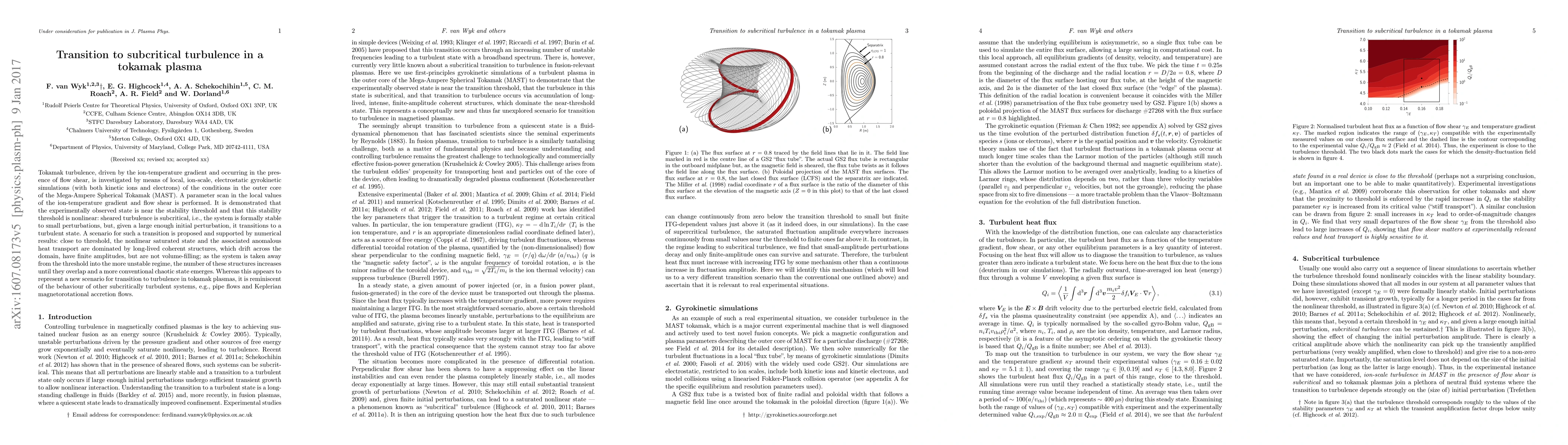 Tokamak turbulence, driven by the ion-temperature gradient and occurring in the presence of flow shear, is investigated by means of local, ion-scale, electrostatic gyrokinetic simulations (with both kinetic ions and electrons) of the conditions in the outer core of the Mega-Ampere Spherical Tokamak (MAST). A parameter scan in the local values of the ion-temperature gradient and flow shear is performed. It is demonstrated that the experimentally observed state is near the stability threshold and that this stability threshold is nonlinear: sheared turbulence is subcritical, i.e. the system is formally stable to small perturbations, but, given a large enough initial perturbation, it transitions to a turbulent state. A scenario for such a transition is proposed and supported by numerical results: close to threshold, the nonlinear saturated state and the associated anomalous heat transport are dominated by long-lived coherent structures, which drift across the domain, have finite amplitudes, but are not volume filling; as the system is taken away from the threshold into the more unstable regime, the number of these structures increases until they overlap and a more conventional chaotic state emerges. Whereas this appears to represent a new scenario for transition to turbulence in tokamak plasmas, it is reminiscent of the behaviour of other subcritically turbulent systems, e.g. pipe flows and Keplerian magnetorotational accretion flows.