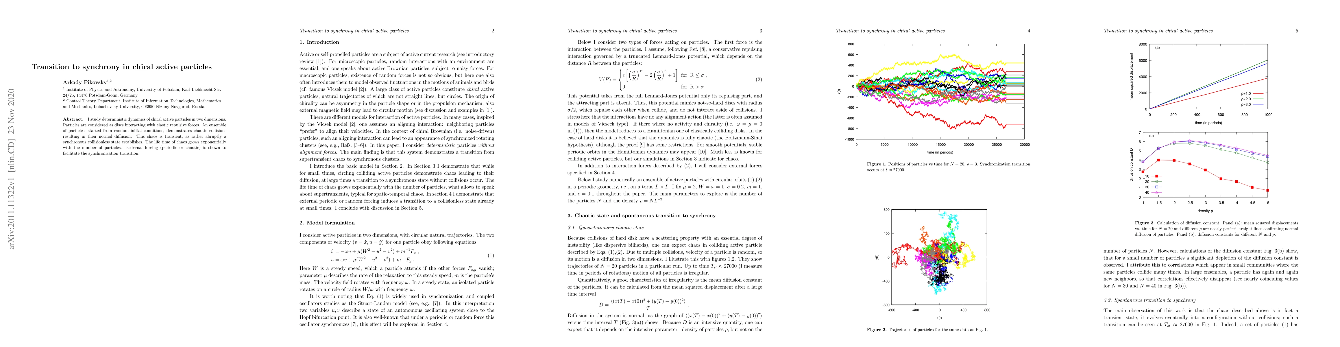 I study deterministic dynamics of chiral active particles in two dimensions. Particles are considered as discs interacting with elastic repulsive forces. An ensemble of particles, started from random initial conditions, demonstrates chaotic collisions resulting in their normal diffusion. This chaos is transient, as rather abruptly a synchronous collisionless state establishes. The life time of chaos grows exponentially with the number of particles. External forcing (periodic or chaotic) is shown to facilitate the synchronization transition.