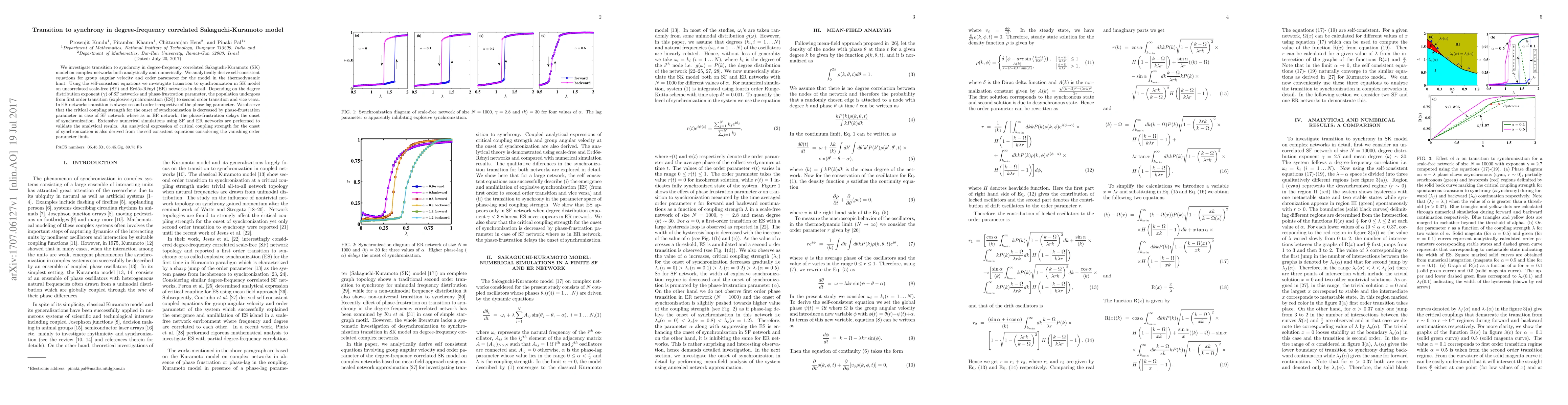 This paper analytically and numerically investigates the transition to synchrony in a degree-frequency correlated Sakaguchi-Kuramoto model on complex networks, deriving self-consistent equations and finding that synchronization transitions vary from first to second order based on network type and parameters. Numerical simulations validate the analytical findings.
