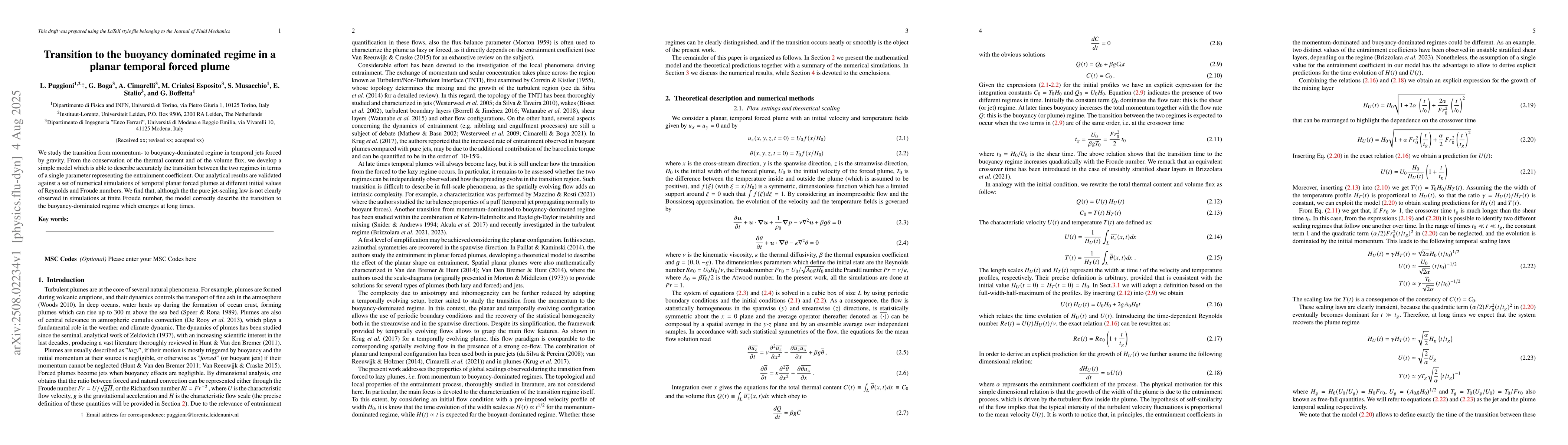 We study the transition from momentum- to buoyancy-dominated regime in temporal jets forced by gravity. From the conservation of the thermal content and of the volume flux, we develop a simple model which is able to describe accurately the transition between the two regimes in terms of a single parameter representing the entrainment coefficient. Our analytical results are validated against a set of numerical simulations of temporal planar forced plumes at different initial values of Reynolds and Froude numbers. We find that, although the the pure jet-scaling law is not clearly observed in simulations at finite Froude number, the model correctly describe the transition to the buoyancy-dominated regime which emerges at long times.