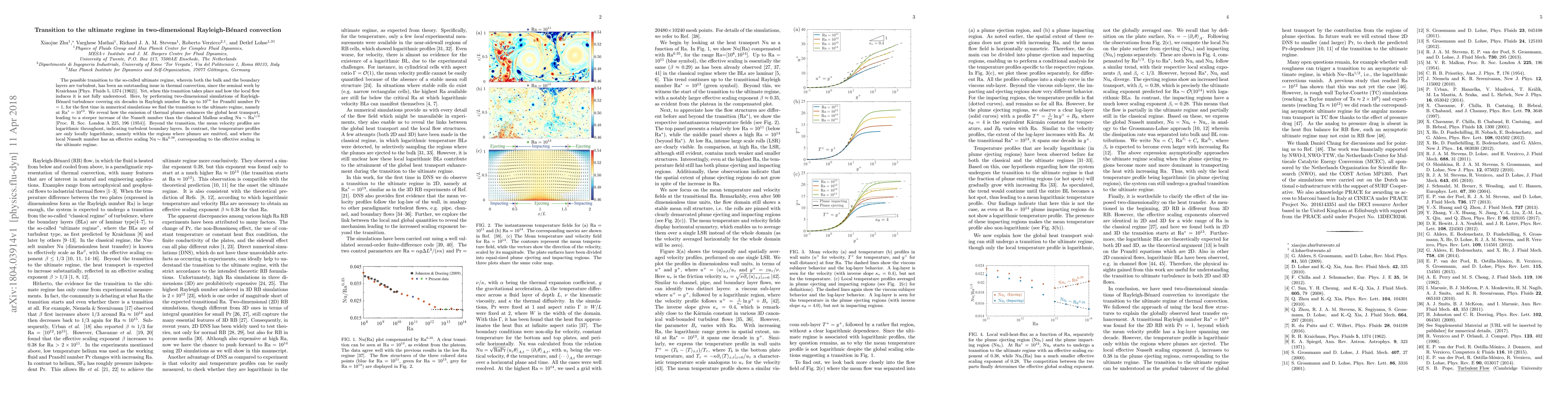 The possible transition to the so-called ultimate regime, wherein both the bulk and the boundary layers are turbulent, has been an outstanding issue in thermal convection, since the seminal work by Kraichnan [Phys. Fluids 5, 1374 (1962)]. Yet, when this transition takes place and how the local flow induces it is not fully understood. Here, by performing two-dimensional simulations of Rayleigh-B\'enard turbulence covering six decades in Rayleigh number Ra up to $10^{14}$ for Prandtl number Pr $=1$, for the first time in numerical simulations we find the transition to the ultimate regime, namely at $\textrm{Ra}^*=10^{13}$. We reveal how the emission of thermal plumes enhances the global heat transport, leading to a steeper increase of the Nusselt number than the classical Malkus scaling $\textrm{Nu} \sim \textrm{Ra}^{1/3}$ [Proc. R. Soc. London A 225, 196 (1954)]. Beyond the transition, the mean velocity profiles are logarithmic throughout, indicating turbulent boundary layers. In contrast, the temperature profiles are only locally logarithmic, namely within the regions where plumes are emitted, and where the local Nusselt number has an effective scaling $\textrm{Nu} \sim \textrm{Ra}^{0.38}$, corresponding to the effective scaling in the ultimate regime.
