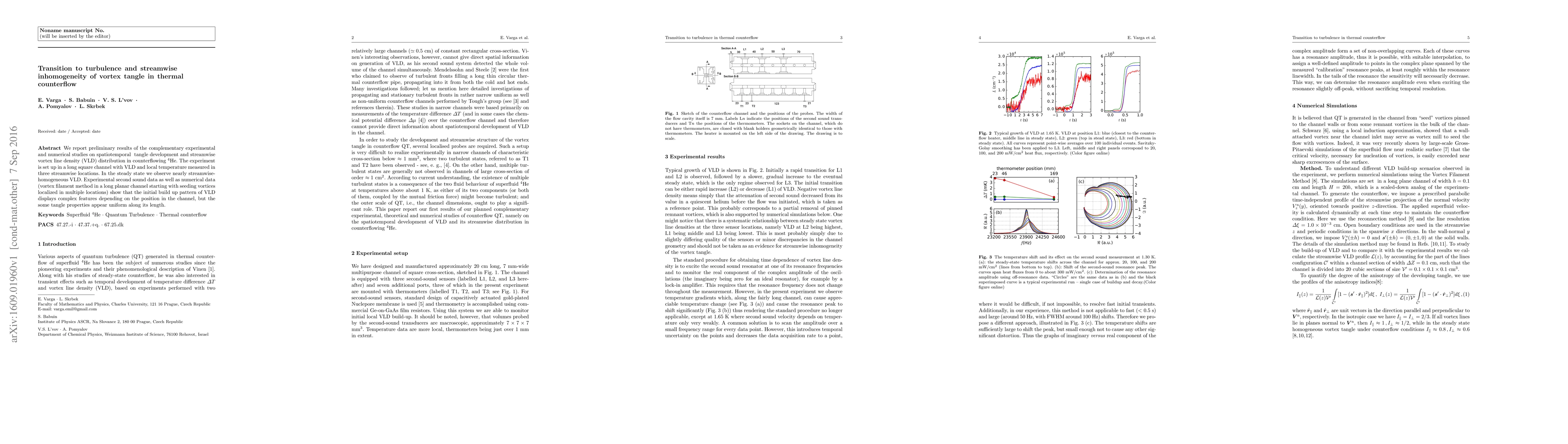 We report preliminary results of the complementary experimental and numerical studies on spatiotemporal tangle development and streamwise vortex line density (VLD) distribution in counterflowing $^4$He. The experiment is set up in a long square channel with VLD and local temperature measured in three streamwise locations. In the steady state we observe nearly streamwise-homogeneous VLD. Experimental second sound data as well as numerical data (vortex filament method in a long planar channel starting with seeding vortices localized in multiple locations) show that the initial build up pattern of VLD displays complex features depending on the position in the channel, but the some tangle properties appear uniform along its length.