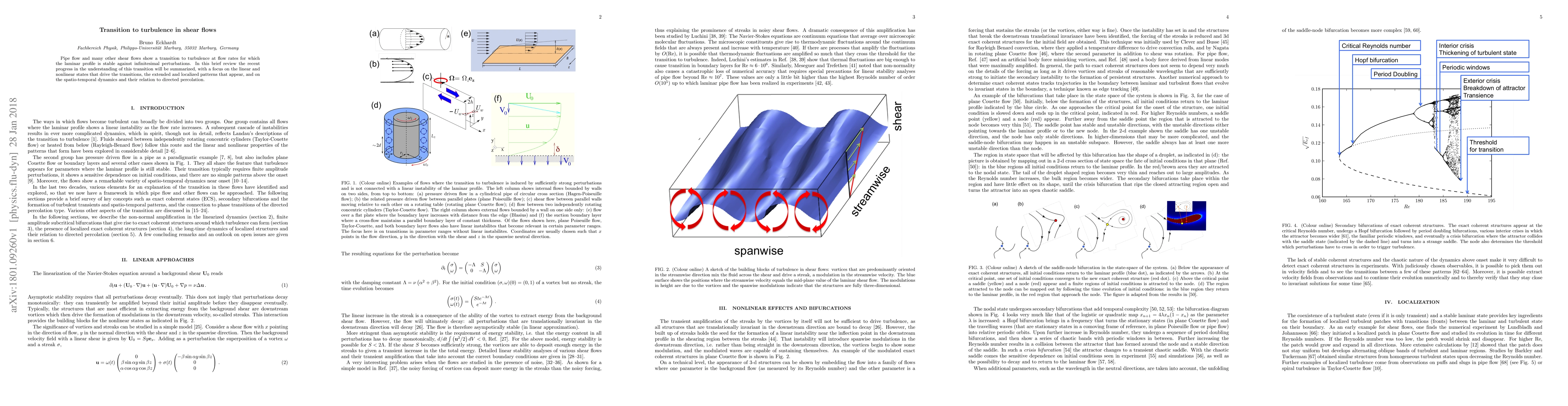 This paper reviews recent advances in understanding the transition to turbulence in shear flows, emphasizing the linear and nonlinear dynamics, the patterns that emerge, and the spatio-temporal dynamics linking these phenomena to directed percolation.