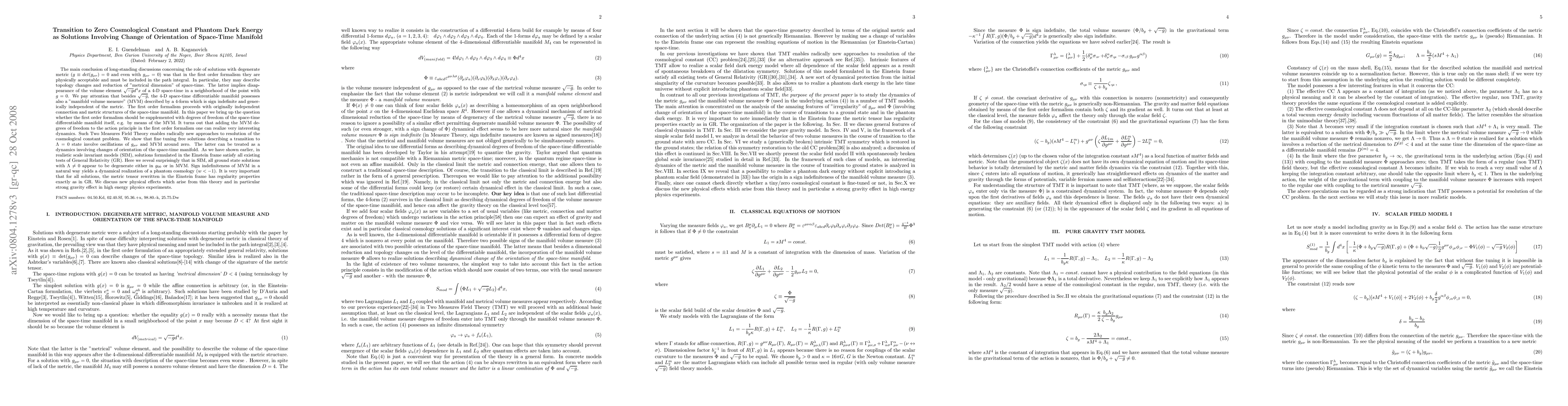 Solutions with degenerate metric ($det(g_{\mu\nu})=0$ or $g_{\mu\nu}=0$) in the first order formalism (FOF) are physically acceptable: they may describe topology changes (Horowitz) and reduction of "metrical dimension" (Tseytlin) of space-time. The latter implies disappearance of the volume element $\sqrt{-g}d^4x$ of 4-D space-time. We pay attention that besides $\sqrt{-g}$, the 4-D space-time differentiable manifold possesses also a "manifold volume measure" (MVM)described by a 4-form which is sign indefinite and generically independent of the metric. The FOF proceeds with originally independent connection and metric structures of the space-time manifold. We bring up the question whether the FOF should be supplemented with degrees of freedom of MVM. Adding such manifold degrees of freedom to the action principle in the FOF we realize very interesting dynamics. Such Two Measures Theory enables radically new approaches to resolution of the cosmological constant problem. We show that fine tuning free solutions describing a transition to $\Lambda =0$ state involve oscillations of $g_{\mu\nu}$ and MVM around zero. The latter can be treated as a dynamics involving changes of orientation of the space-time manifold. As we have shown earlier, in realistic scale invariant models (SIM), solutions formulated in the Einstein frame satisfy all existing tests of General Relativity (GR). Here we reveal surprisingly that in SIM, all ground state solutions with $\Lambda\neq 0$ appear to be degenerate either in $g_{00}$ or in MVM. Sign indefiniteness of MVM in a natural way yields a dynamical realization of a phantom cosmology ($w<-1$). For all solutions, the metric tensor rewritten in the Einstein frame has regularity properties exactly as in GR. A possibility of a strong gravity effect in LHC experiments is discussed.