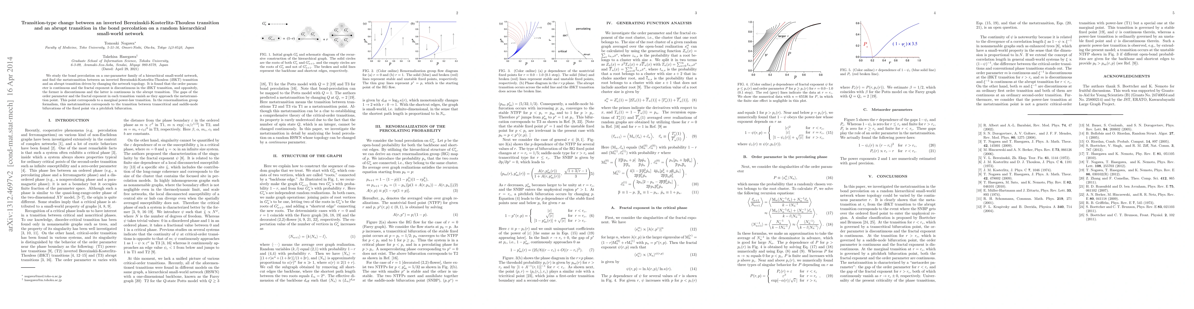 We study bond percolation on a one-parameter family of hierarchical small-world network, and find a meta-transition between the inverted BKT transition and the abrupt transition driven by changing the network topology. It is found that the order parameter is continuous and fractal exponent is discontinuous in the inverted BKT transition, and oppositely, the former is discontinuous and the latter is continuous in the abrupt transition. The gaps of the order parameter and fractal exponent in each transition go to vanish as approaching the meta-transition point. This point corresponds to a marginal power-law transition. In the renormalization group formalism, this meta-transition corresponds to the transition between transcritical and saddle-node bifurcations of the fixed point via a pitchfork bifurcation.