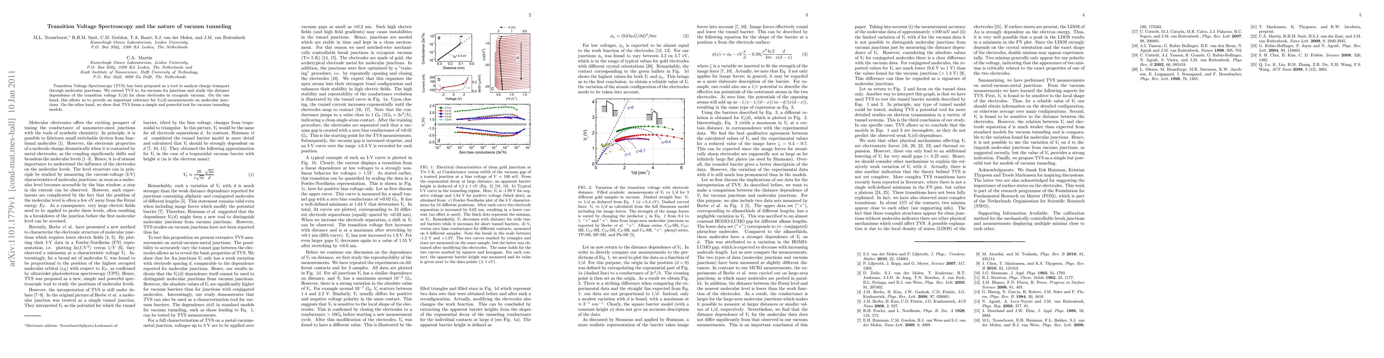This paper utilizes Transition Voltage Spectroscopy (TVS) to analyze charge transport in Au-vacuum-Au junctions, revealing the distance dependence of the transition voltage V_t(d) in cryogenic vacuum. It provides a reference for molecular junction studies and validates TVS as a robust method for evaluating vacuum tunneling models.