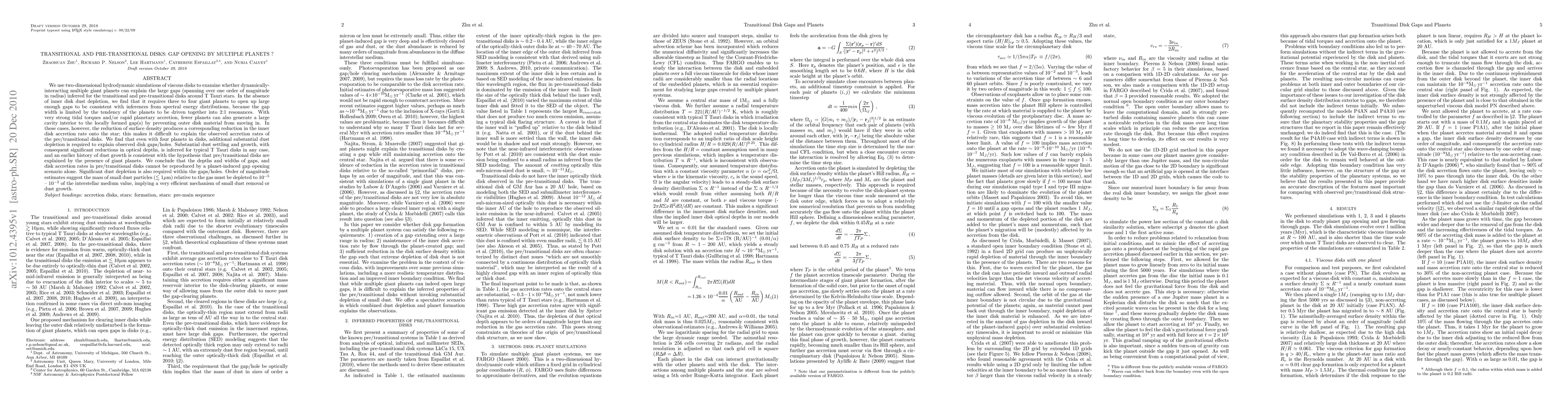 This paper investigates the role of multiple giant planets in creating large gaps in transitional and pre-transitional disks around T Tauri stars using 2D hydrodynamic simulations. It concludes that three to four planets are needed to form significant gaps, but significant dust depletion is also required to match observations, suggesting that a planet-induced gap opening scenario alone is insufficient.