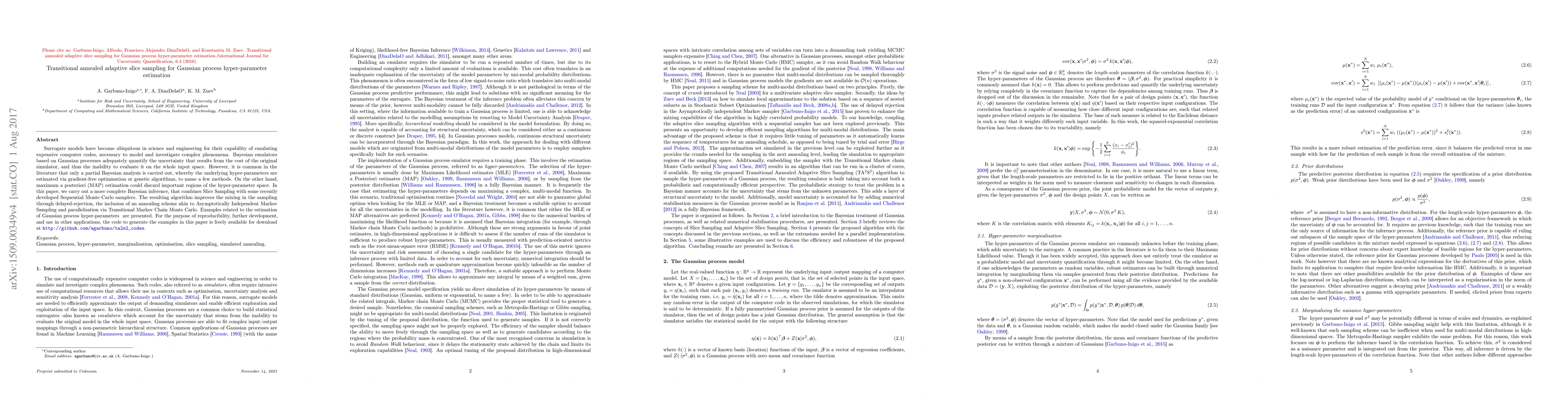 This paper proposes a novel transitional annealed adaptive slice sampling method for estimating Gaussian process hyper-parameters, combining Slice Sampling with Sequential Monte Carlo samplers to improve sampling efficiency and mixing. The method is demonstrated through examples and the code is made available for reproducibility and further applications.